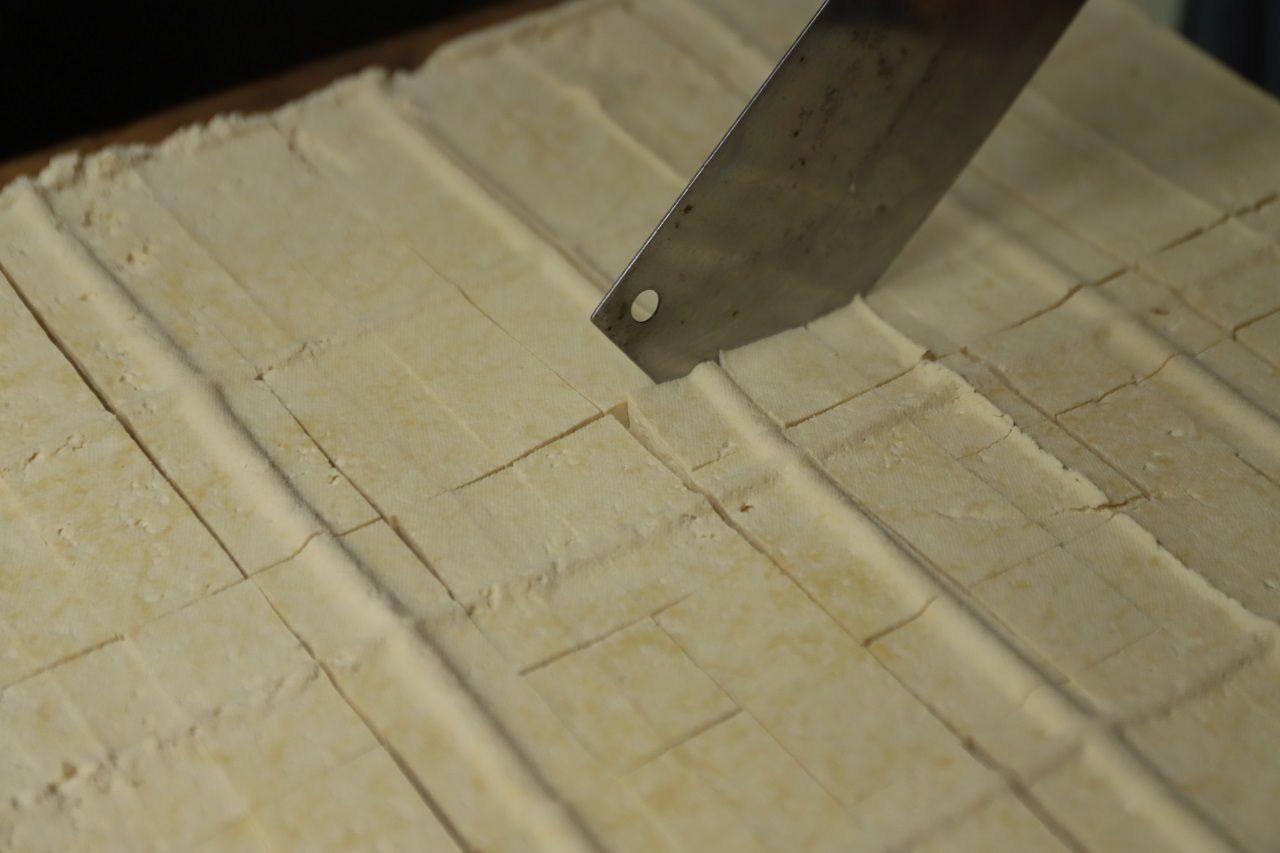 做豆腐的黄豆很考究,不然做出的腐乳,韧劲不够,成形不好,豆腐水分不能太大,要将豆腐隔着纱布把它压干,使其不再渗水。切成小方块,晾放几个小时,收敛水分后用干净的木箱,整齐码放。放在阴凉处,一周,豆腐就会长出一层白毛,这时便可将炒制好辣椒,花椒捣细拌和均匀。