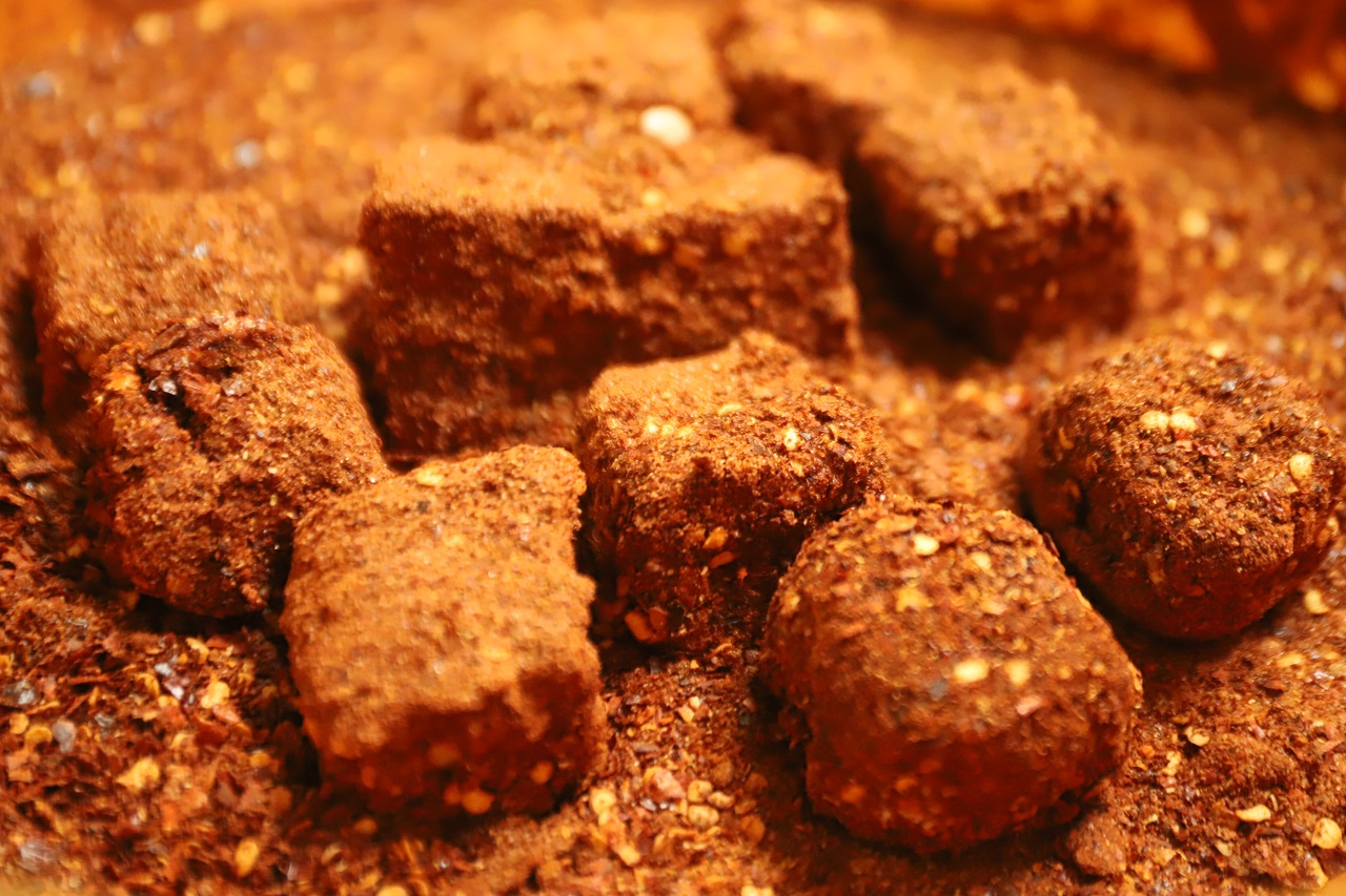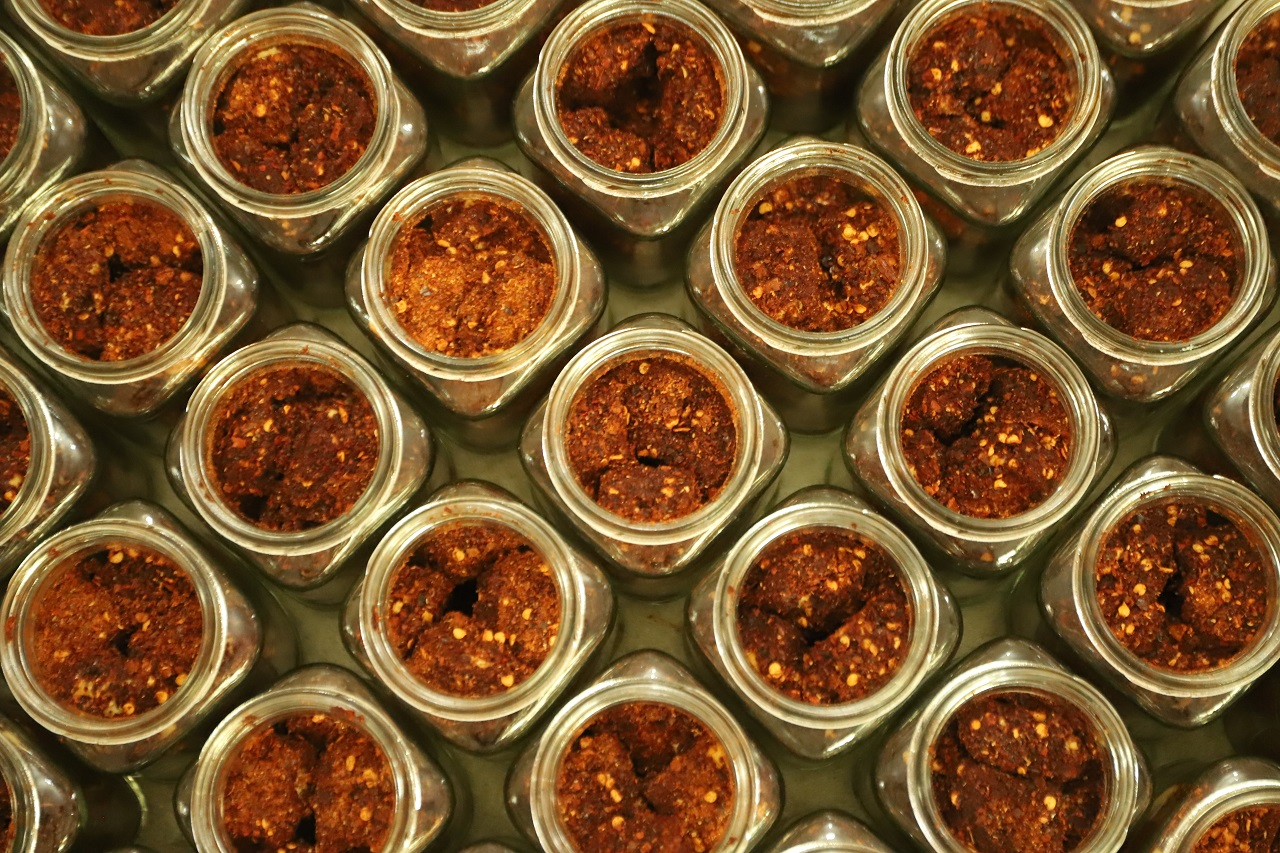 新鲜的腐乳发酵7天后完成,再将生态种植的老品种辣椒,和生态大红袍花椒,经柴火烤熟,碾磨成粉,加入藏青盐拌匀,将发酵好的豆腐乳与这些佐料拌匀(加甜酒酿),装瓶,之后加入炒制好的油研素香的菜籽油,封瓶存放一个星期而成。