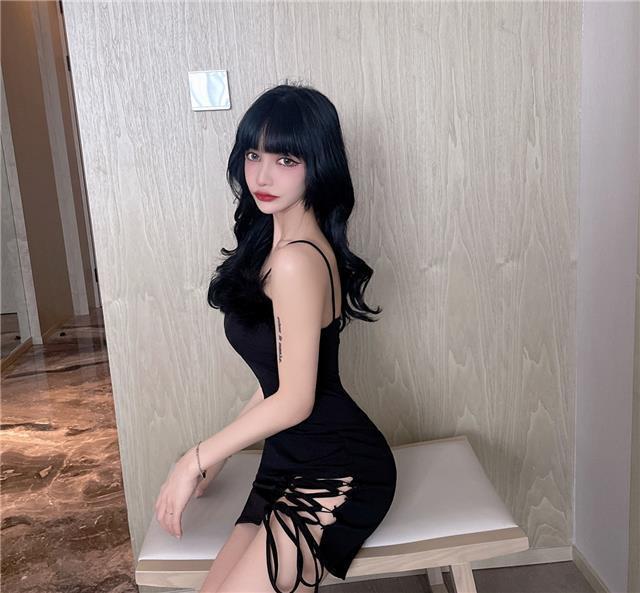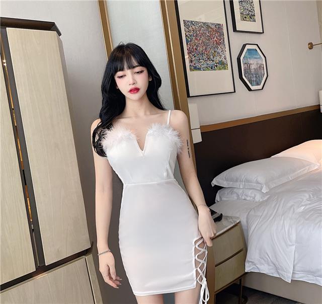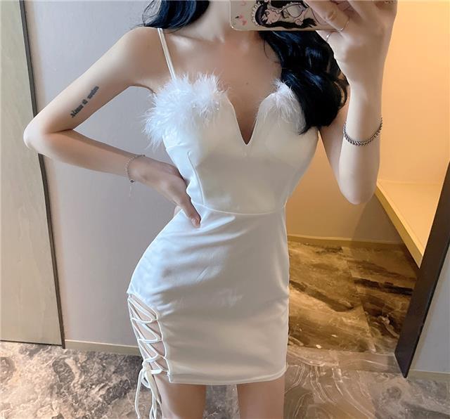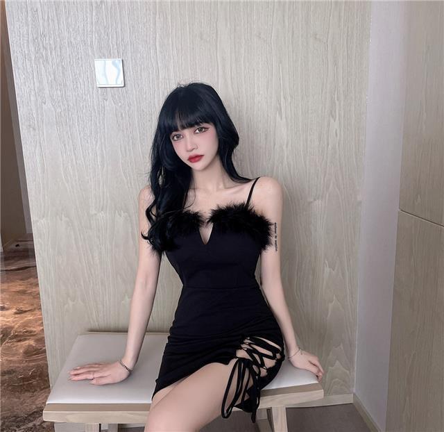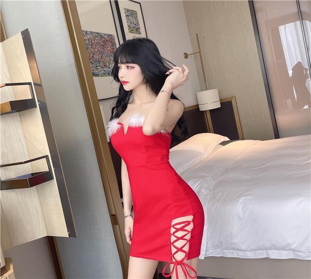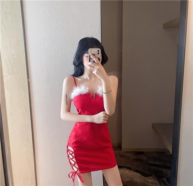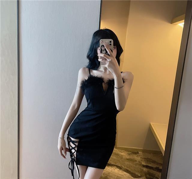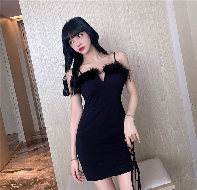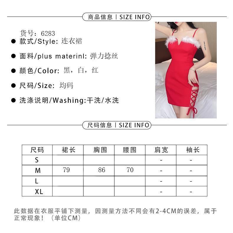 秋季网红性感辣妹绑带毛毛露背短裙圣诞节修身显瘦吊带包臀连衣裙