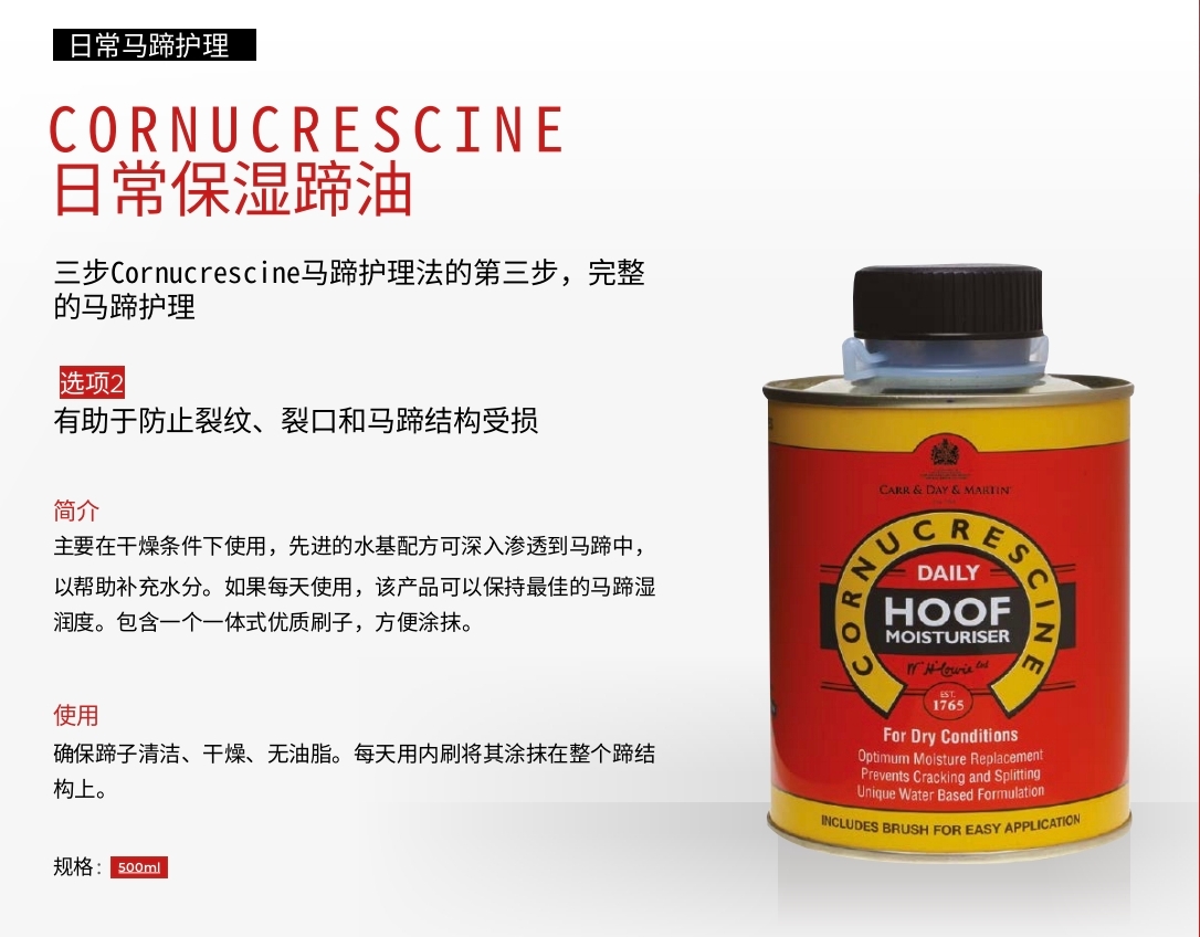 CORNUCRESCINE 日常保湿蹄油 采用进的水基配方能够深入渗透到马蹄中,帮助补充水分,有效防止裂纹、裂口和马蹄结构受损。同时,一体式刷子的设计也方便了蹄油的涂抹和使用。通过每天使用该产品,可以保持最佳的马蹄湿润度,使马匹的蹄部更加健康、美丽。