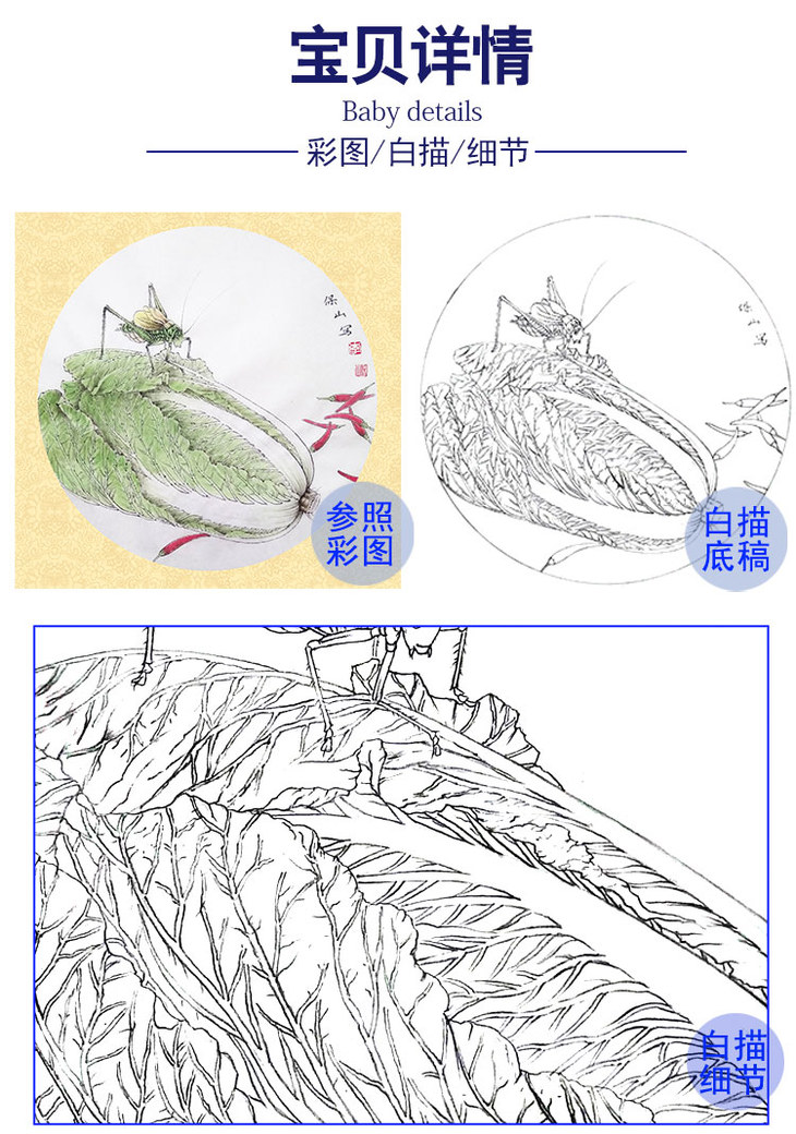 工笔蔬菜白描底稿-李保山-白菜蝈蝈草虫小品《鸿运百财图》-EL14