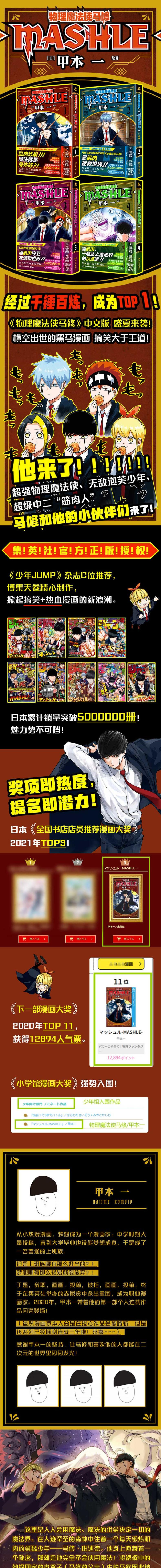 甲本一,日本知名新生代热血漫画家。2020年代表作《物理魔法使马修》出版单行本后,火速入围“小学馆漫画大奖”&“下一部漫画大奖”,荣获“日本书店店员荐漫画大奖”第3名。