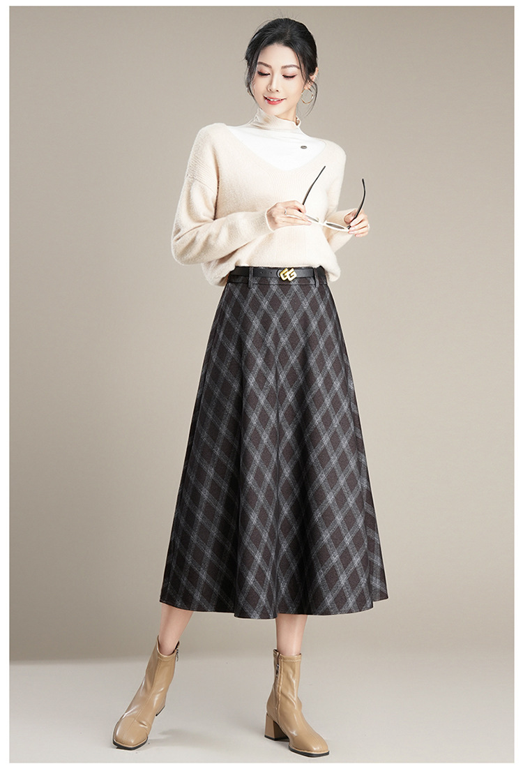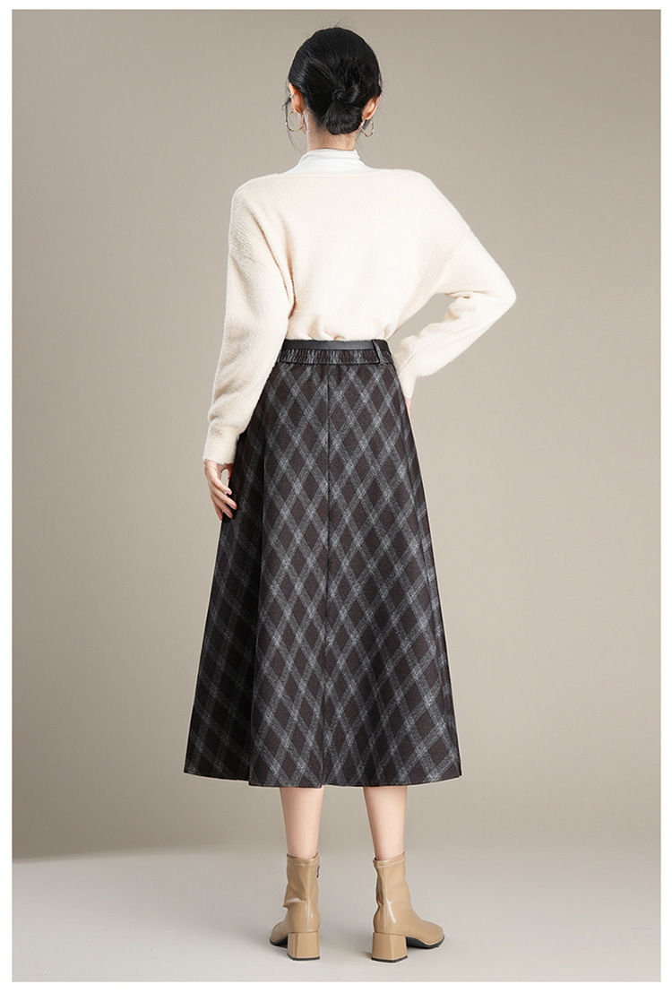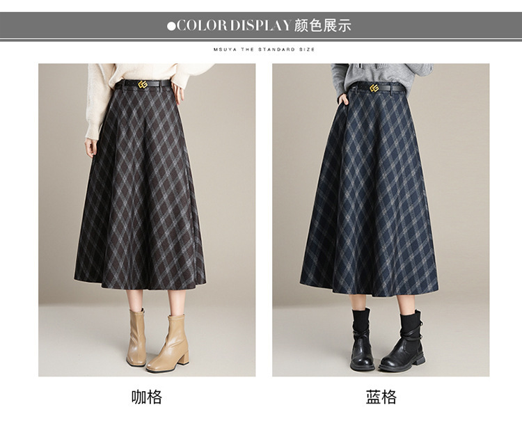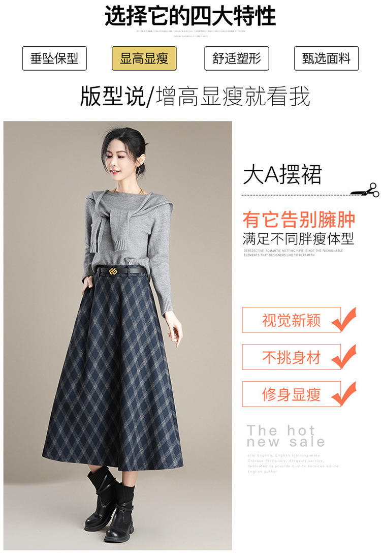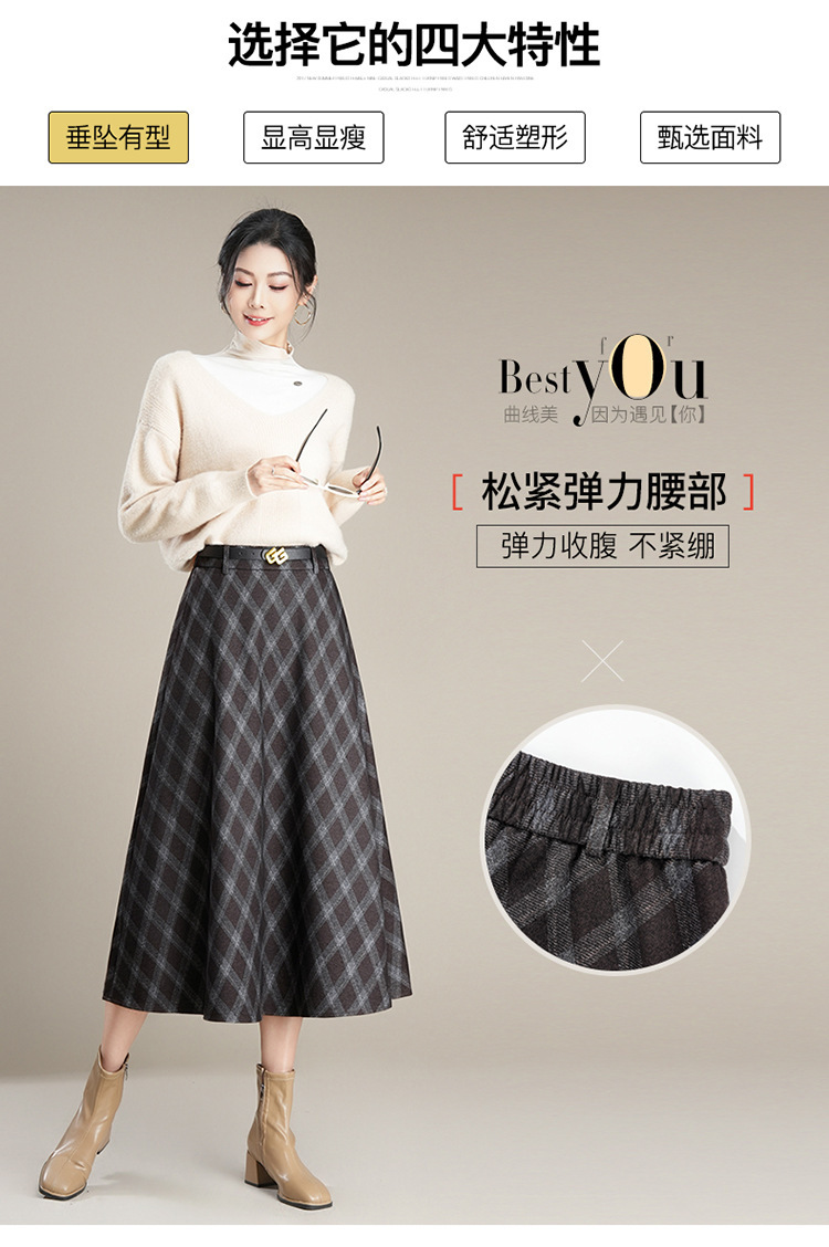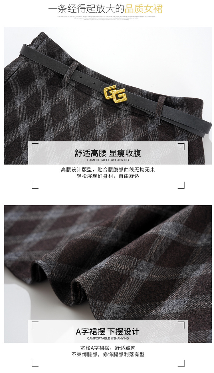 QYM 1621-Y毛呢格子半身裙高腰遮胯A字通勤裙