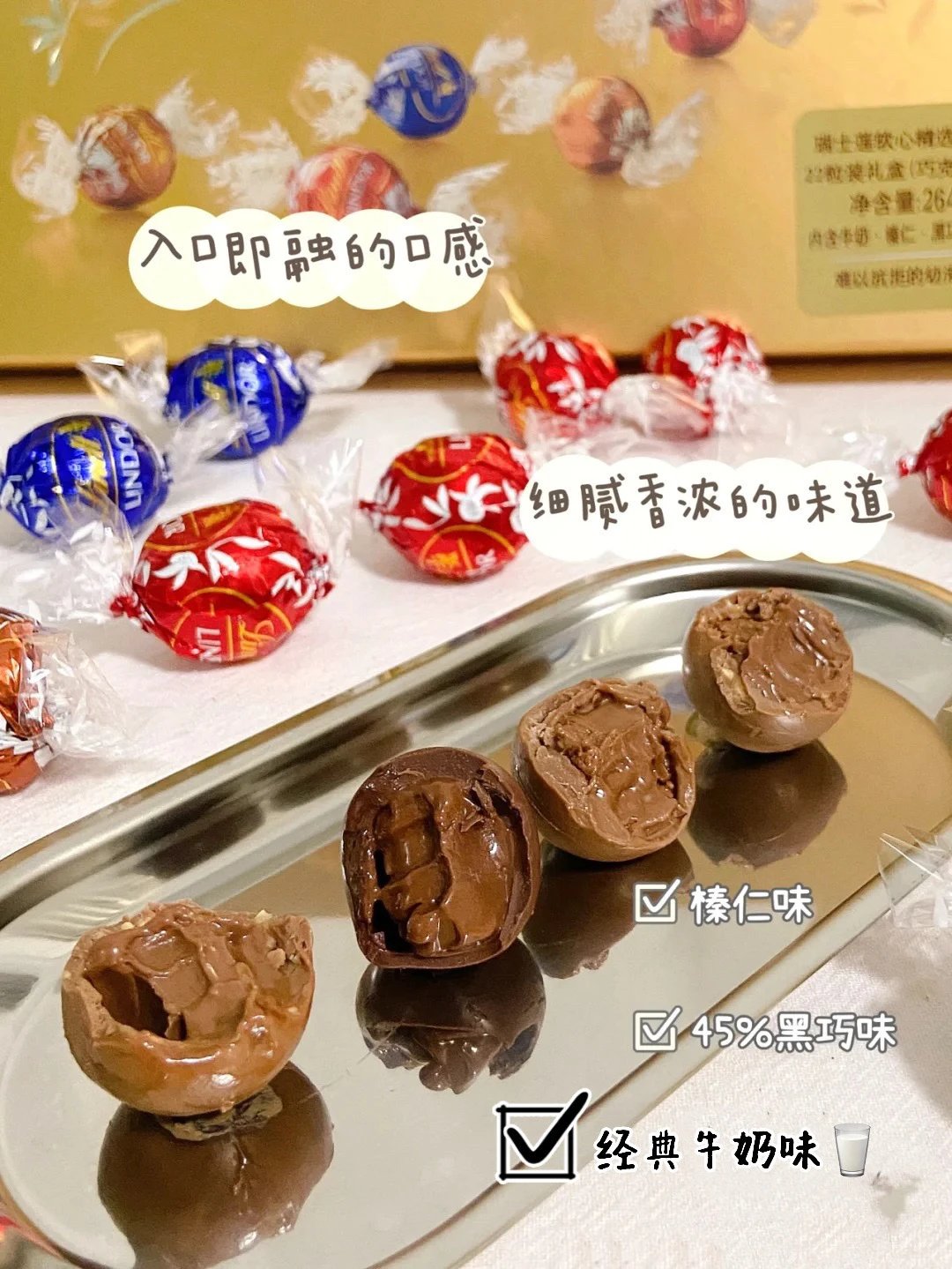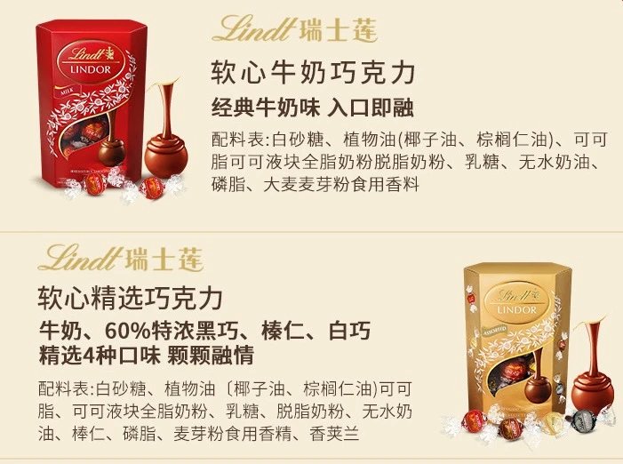 瑞士莲新口味到货 全球排名第一的巧克力 『Lindt瑞士莲 软心巧克力礼盒分享装』 瑞士国宝巧克力天花板来了 软心爆浆的巧克力 天猫旗舰店 79+/盒 甜而不腻,香醇无比 颜值与美味并存~ 精选优质可可豆,源自黄金产区 长达72小时研拌工艺 入口即融,丝滑细腻 四款经典口味、新口味任选 什锦金色 薄荷黑巧全网断货