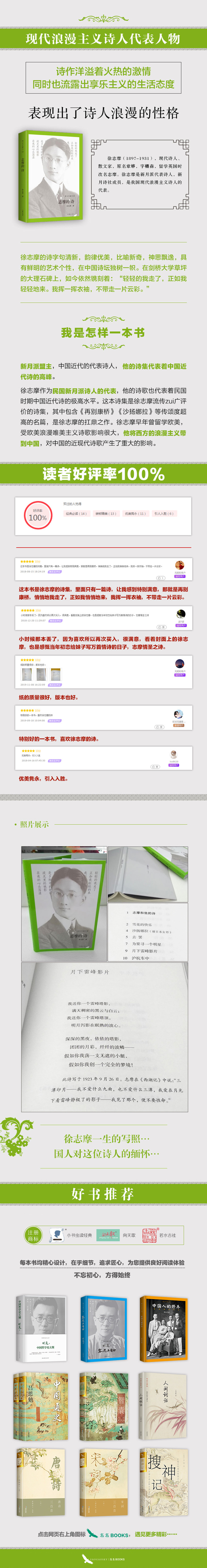徐志摩作为民国新月派诗人的代表,他的诗歌也代表着民国时期中国近代诗的极高水平。这本诗集是徐志摩流传*广评价*的诗集,其中包含《再别康桥》《沙扬娜拉》等传颂度超高的名篇,是徐志摩的扛鼎之作。徐志摩早年曾留学欧美,受欧美浪漫唯美主义诗歌影响很大,他将西方的浪漫主义带到中国,对中国的近现代诗歌产生了重大的影响。