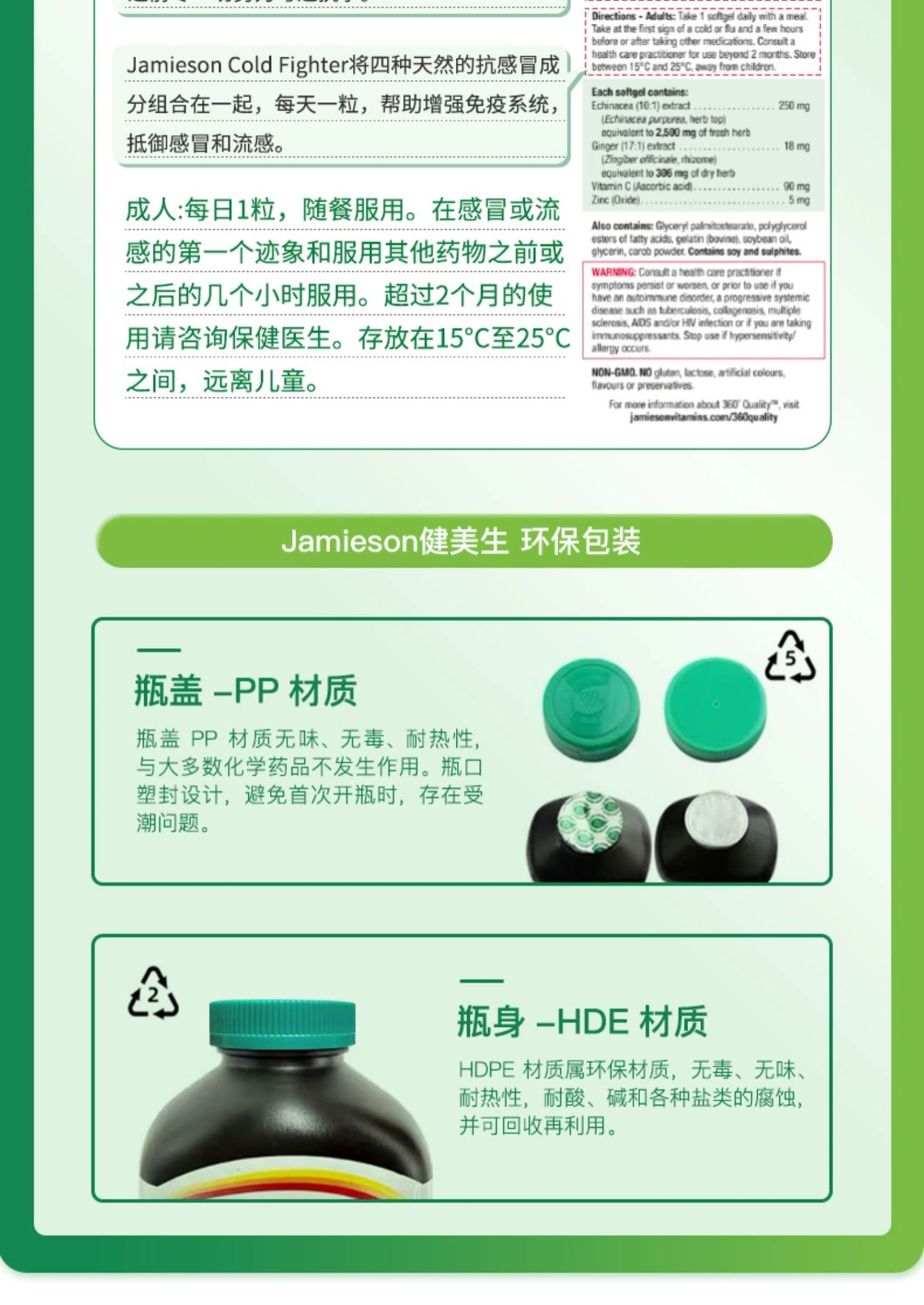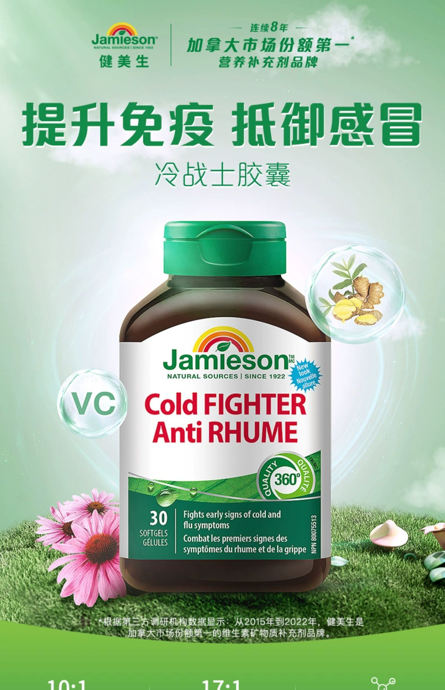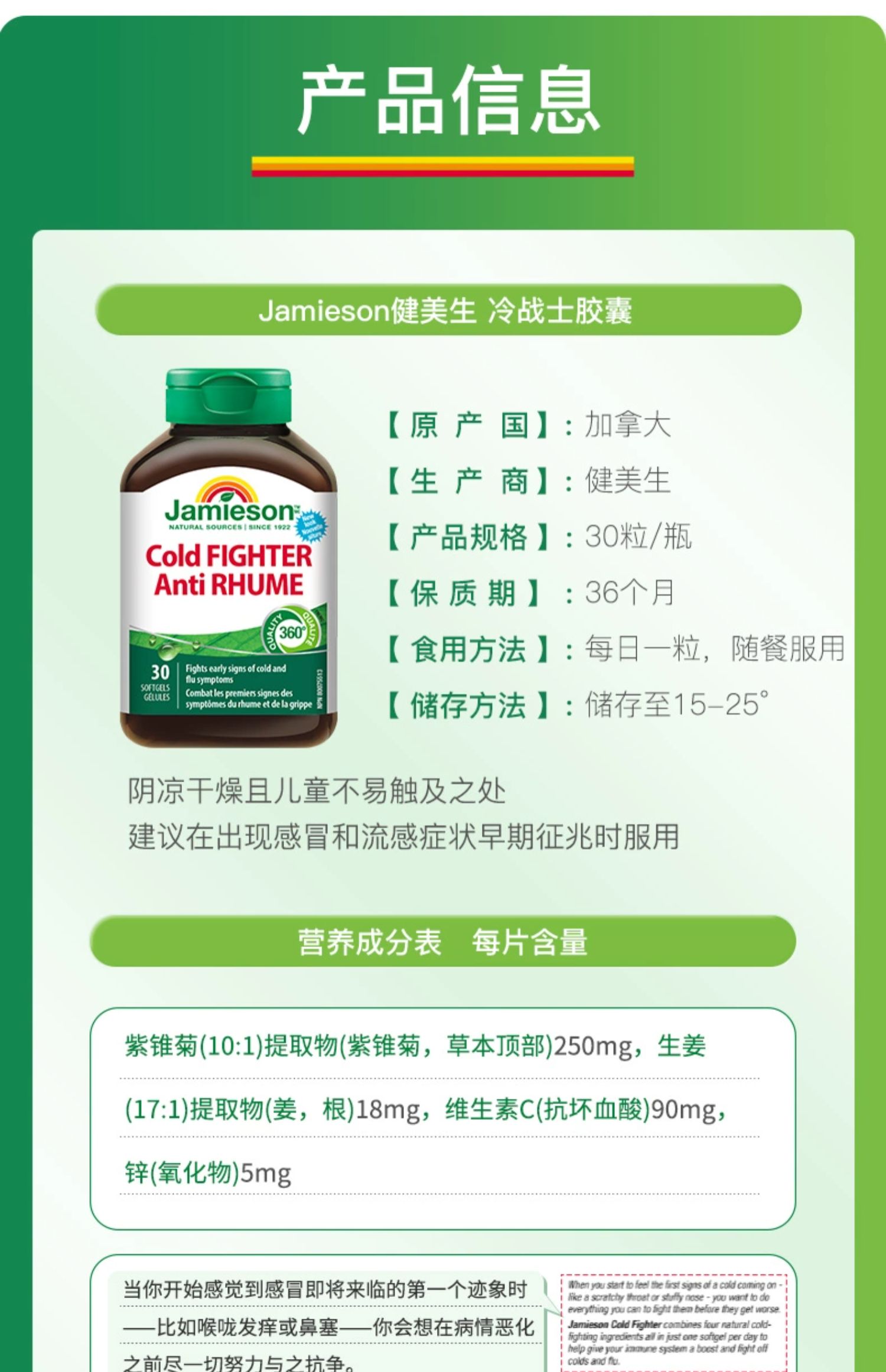 紫锥菊 | 冷战士胶囊 缩短感冒进程 Jamieson健美生冷战士胶囊30粒cold fighter