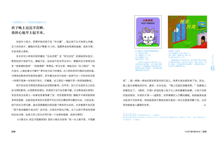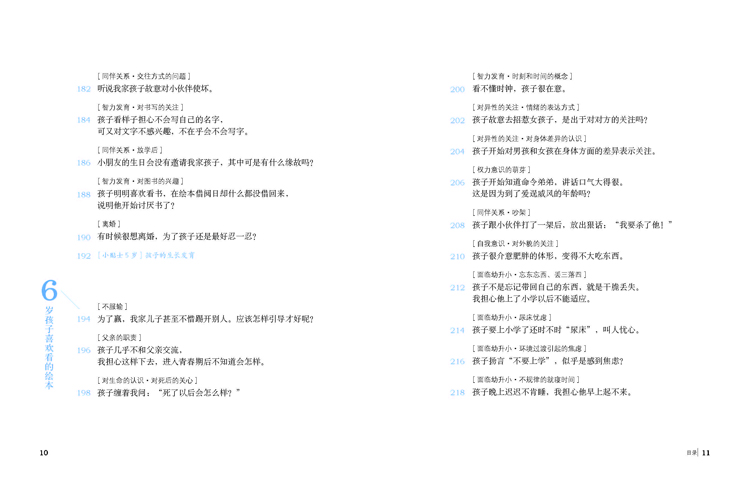 书中针对0~6岁孩子在生长发育中出现的各种情况以及家长们的育儿烦恼,给出了实用性建议,作为新手妈妈,读完这些建议感到很安心。而且每个情境以及给出的建议只有两页,刚好可以利用家务和育儿过程中的碎片时间来阅读。此外,作者还推荐了每个年龄段的孩子喜欢阅读的绘本,对妈妈们来说也是很好的参考。