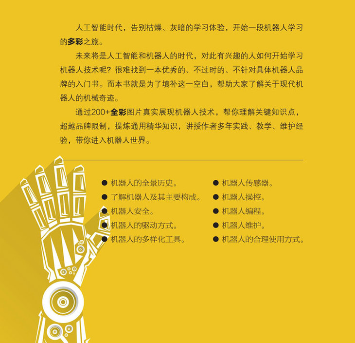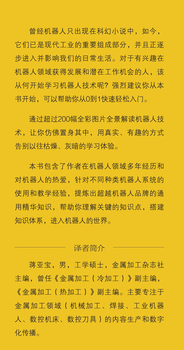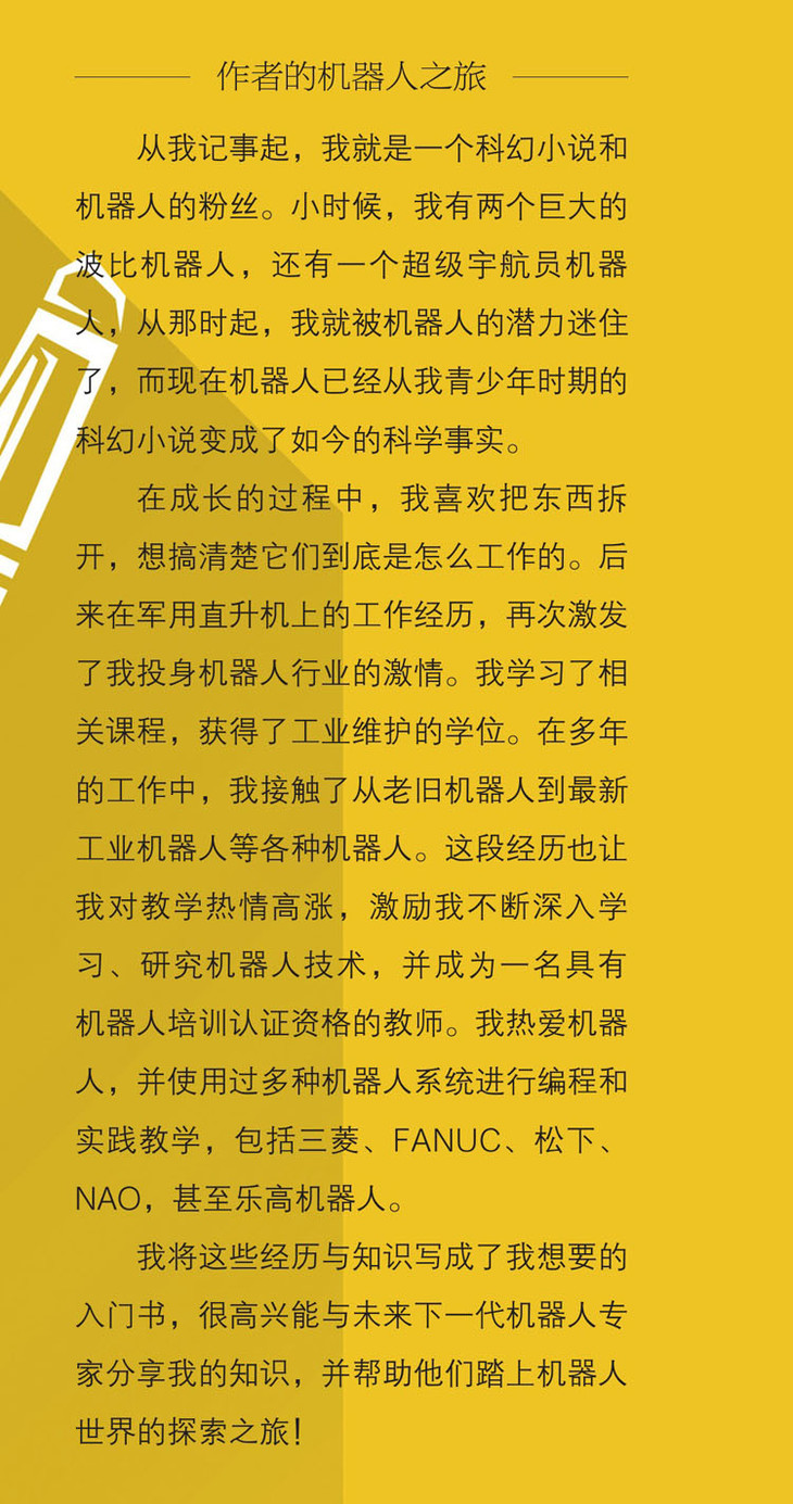 本书可以让读者了解作者在机器人领域多年的工作经验,以及针对不同种类机器人系统的使用和教学经验。本书会提供案例、技巧、注意事项和最佳范例,给予读者大量的信息和知识,而无须读者花费数年时间来学习。本书用大量的图片帮助读者理解关键的知识点,让读者能够一窥机器人的世界,否则,全凭读者自己是非常困难,甚至是不可能的。读者在学习本书的过程中会体会到这一点。