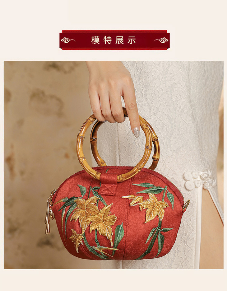 国风包手提斜跨,刺绣南瓜包女包竹节手提包枫叶刺绣QB-秋枫竹青