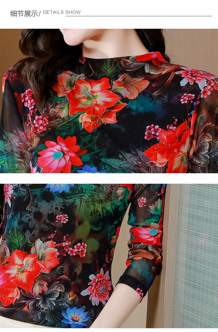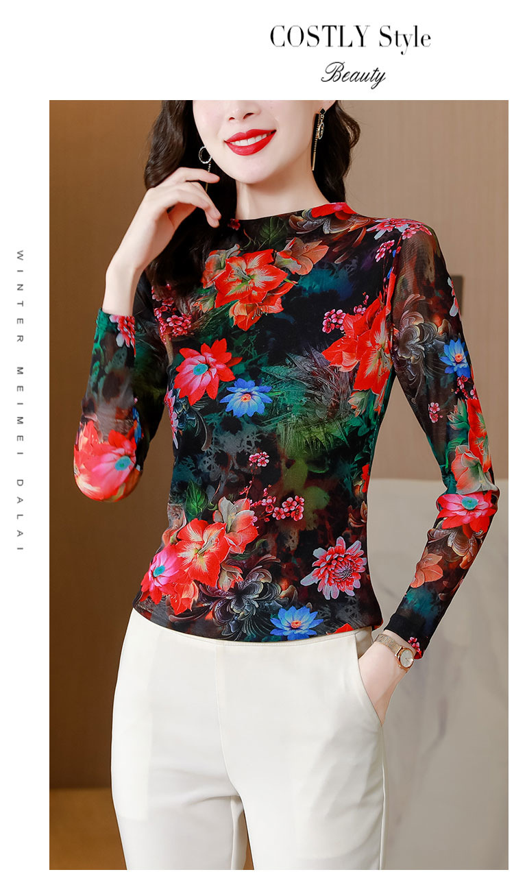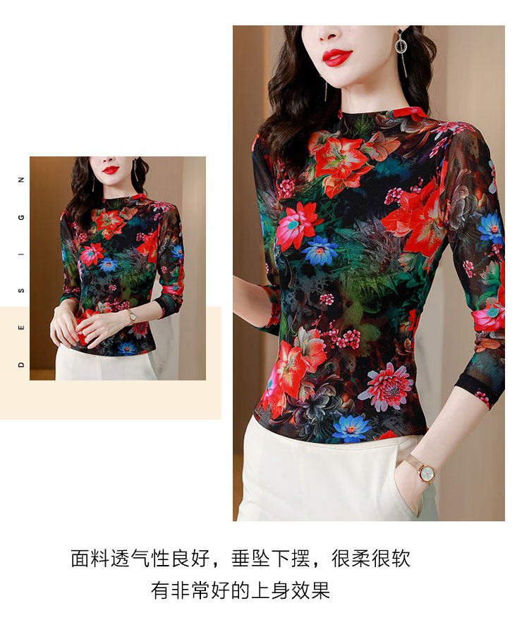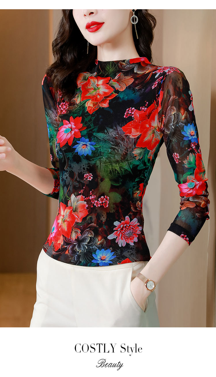 KQL 520N98351网纱印花T恤 弹力修身套头小衫
