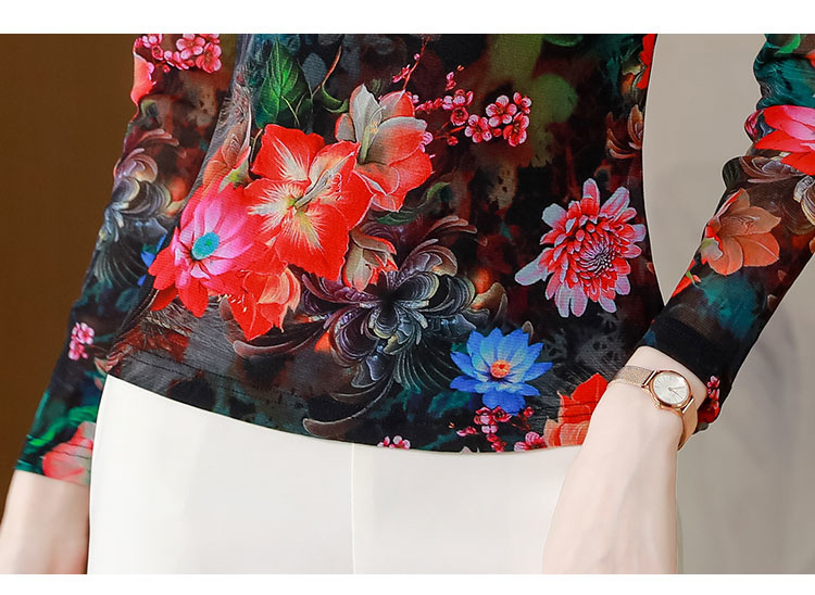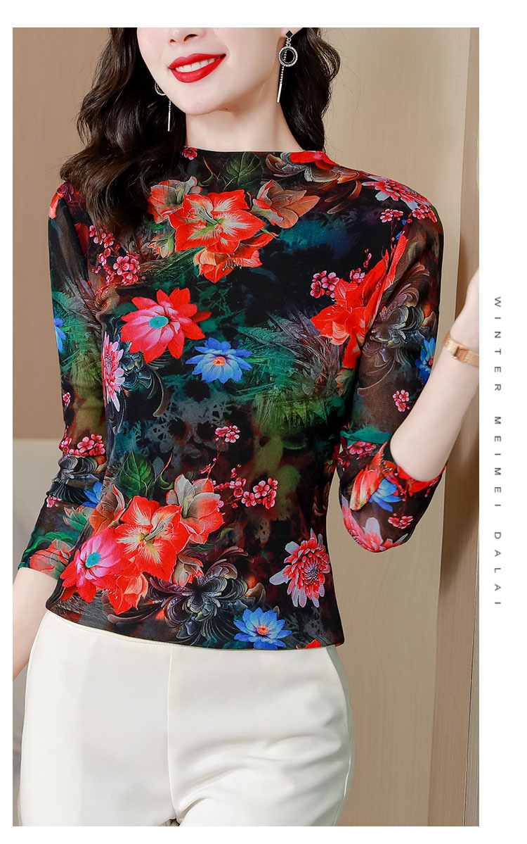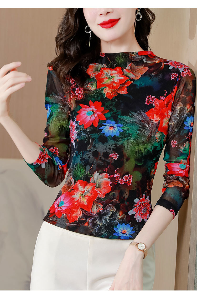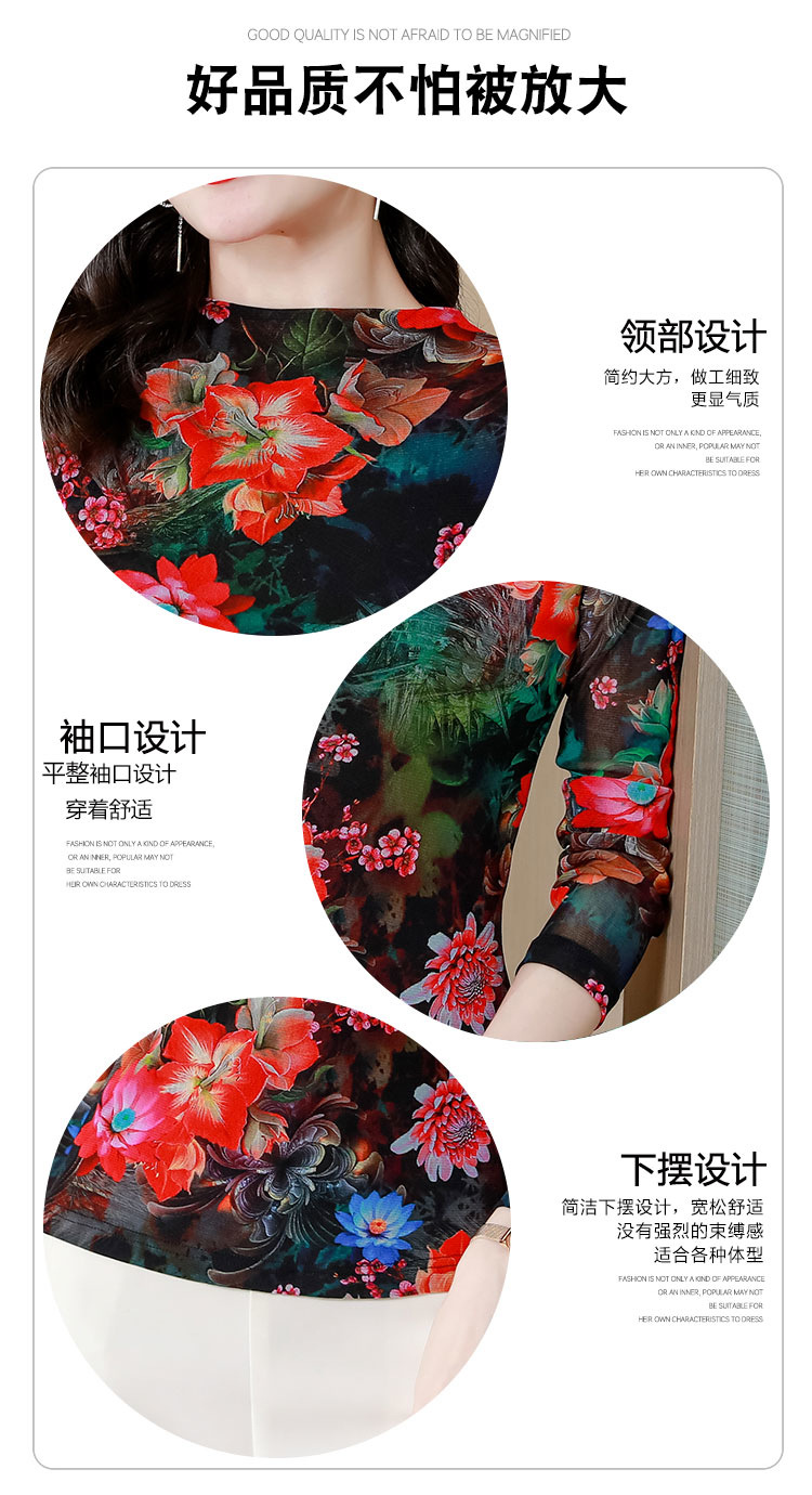 KQL 520N98351网纱印花T恤 弹力修身套头小衫