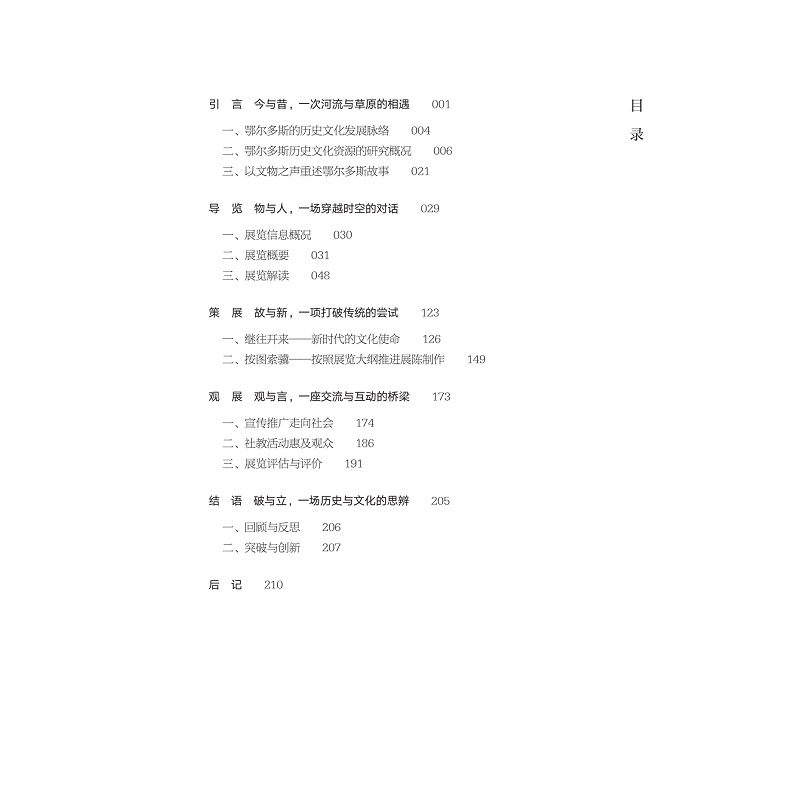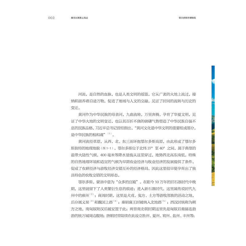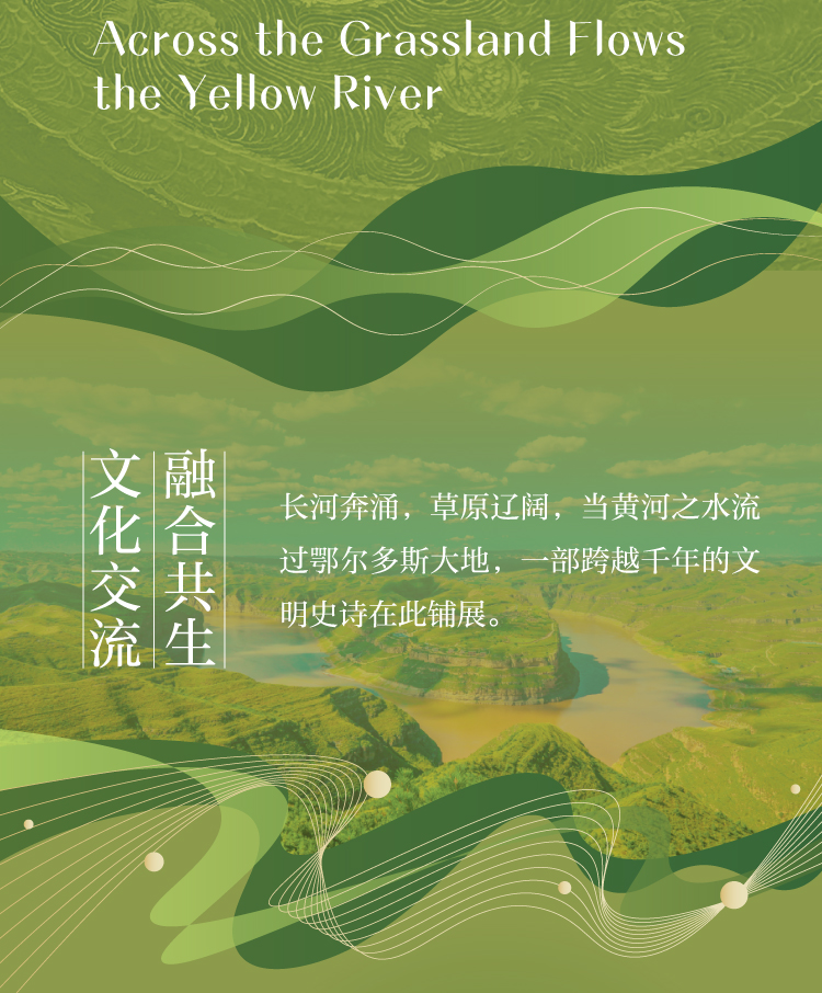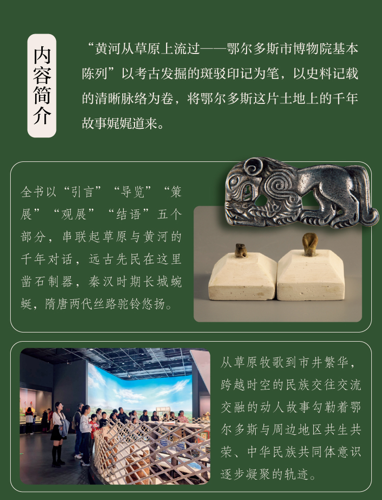长河奔涌,草原辽阔,当黄河之水流过鄂尔多斯大地,一部跨越千年的文明史诗在此铺展。“黄河从草原上流过——鄂尔多斯市博物院基本陈列”以考古发掘的斑驳印记为笔,以史料记载的清晰脉络为卷,将鄂尔多斯这片土地上的千年故事娓娓道来。全书以“引言”“导览”“策展”“观展”“结语”五个部分,串联起草原与黄河的千年对话,远古先民在这里凿石制器,秦汉时期长城蜿蜒,隋唐两代丝路驼铃悠扬……从草原牧歌到市井繁华,跨越时空的民族交往交流交融的动人故事勾勒着鄂尔多斯与周边地区共生共荣、中华民族共同体意识逐步凝聚的轨迹。