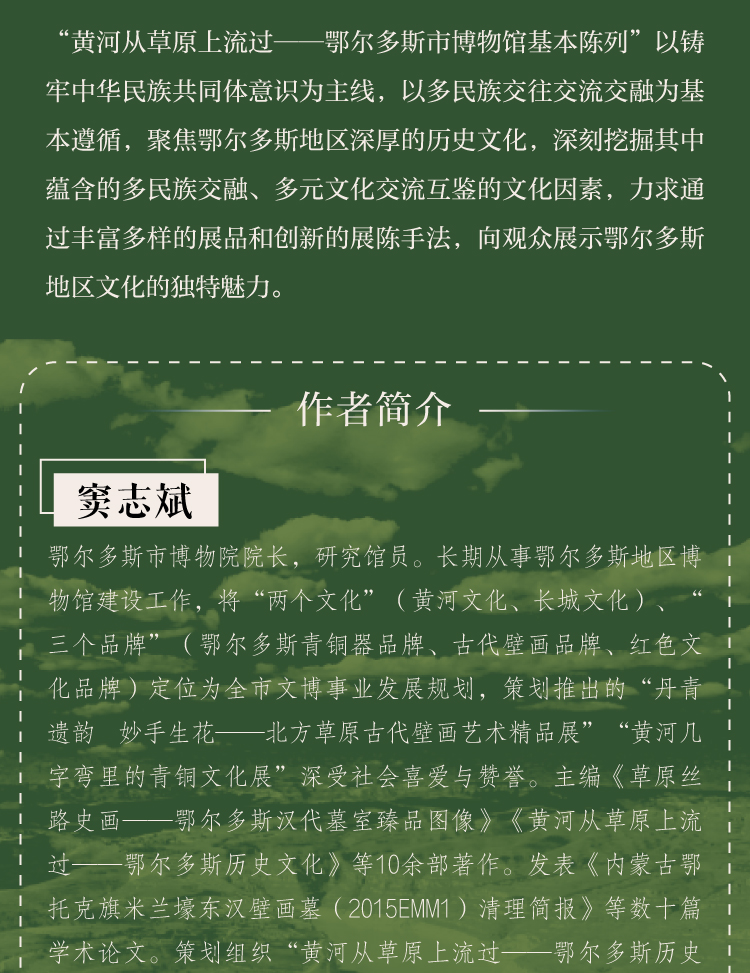 窦志斌,鄂尔多斯市博物院院长,研究馆员。长期从事鄂尔多斯地区博物馆建设工作,将“两个文化”(黄河文化、长城文化)、“三个品牌”(鄂尔多斯青铜器品牌、古代壁画品牌、红色文化品牌)定位为全市文博事业发展规划,策划推出的“丹青遗韵 妙手生花——北方草原古代壁画艺术精品展”“黄河几字弯里的青铜文化展”深受社会喜爱与赞誉。主编《草原丝路史画——鄂尔多斯汉代墓室臻品图像》《黄河从草原上流过——鄂尔多斯历史文化》等10余部著作。发表《内蒙古鄂托克旗米兰壕东汉壁画墓(2015EMM1)清理简报》等数十篇学术论文。策划组织“黄河从草原上流过——鄂尔多斯历史文化陈列”“峥嵘岁月 光辉历程——鄂尔多斯革命历史展”等具有影响力的展览。