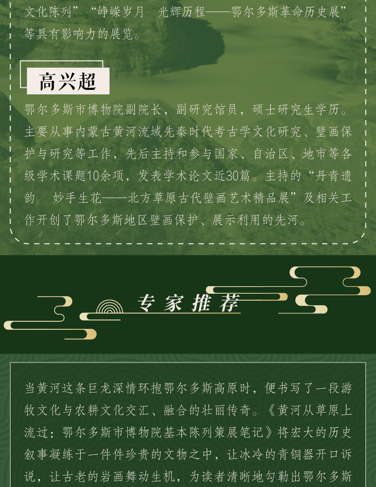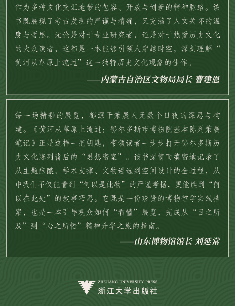 每一场精彩的展览,都源于策展人无数个日夜的深思与构建。《黄河从草原上流过:鄂尔多斯市博物院基本陈列策展笔记》正是这样一把钥匙,带领读者一步步打开鄂尔多斯历史文化陈列背后的“思想密室”。该书深情而缜密地记录了从主题酝酿、学术支撑、文物遴选到空间设计的全过程,从中我们不仅能看到“何以是此物”的严谨考据,更能读到“何以在此处”的叙事巧思。它既是一份珍贵的博物馆学实践档案,也是一本引导观众如何“看懂”展览,完成从“目之所及”到“心之所悟”精神升华之旅的指南。