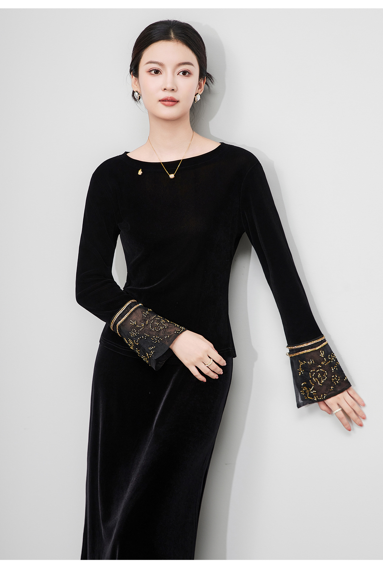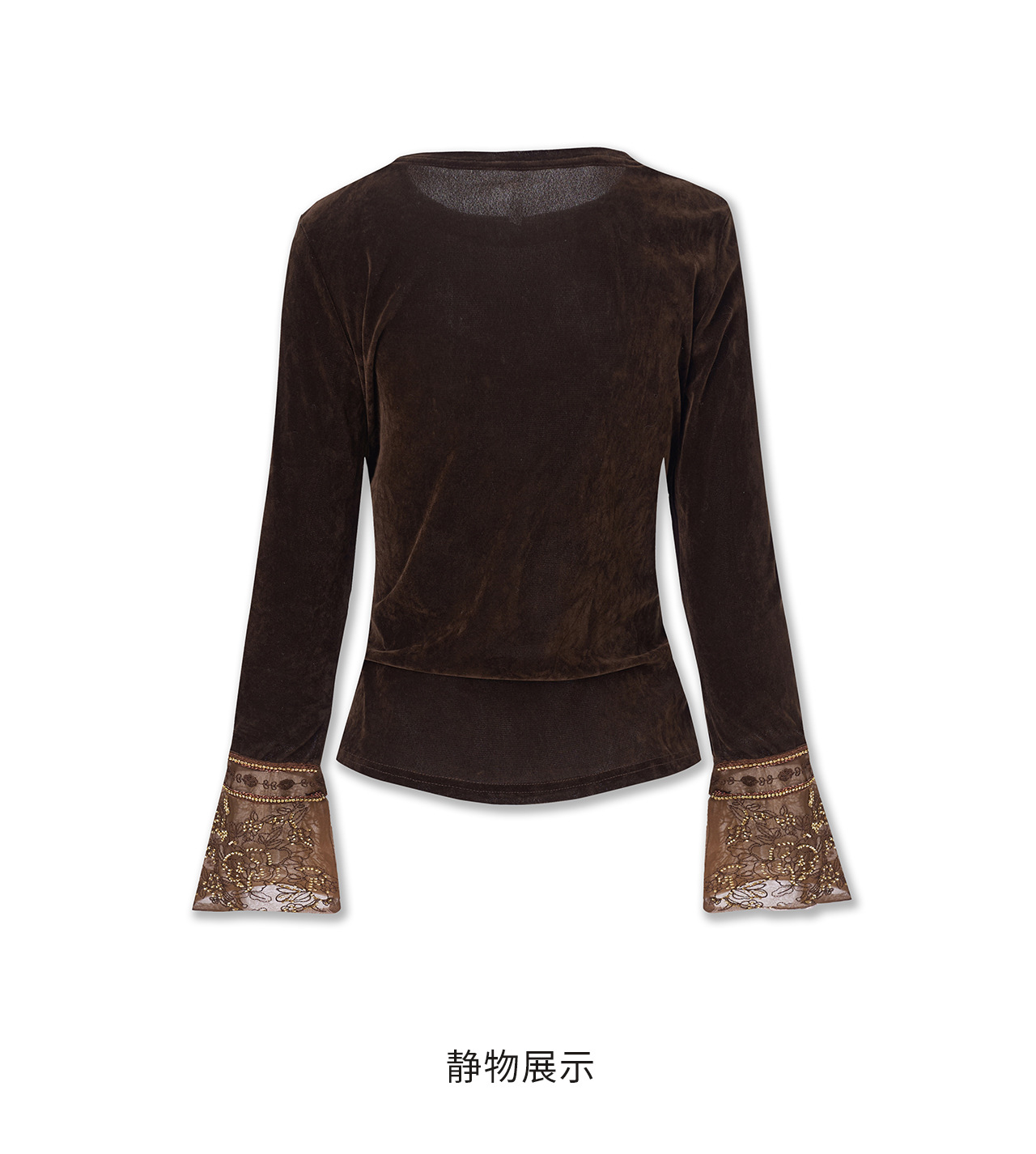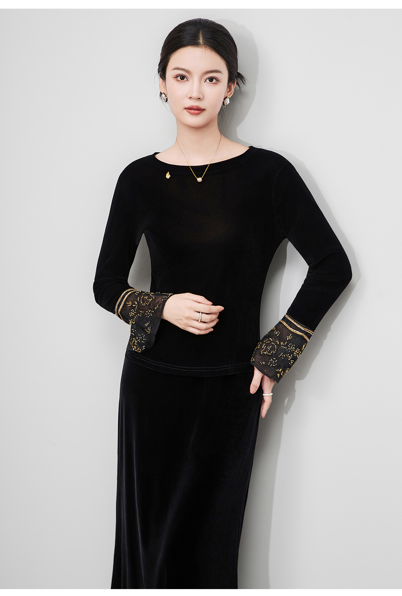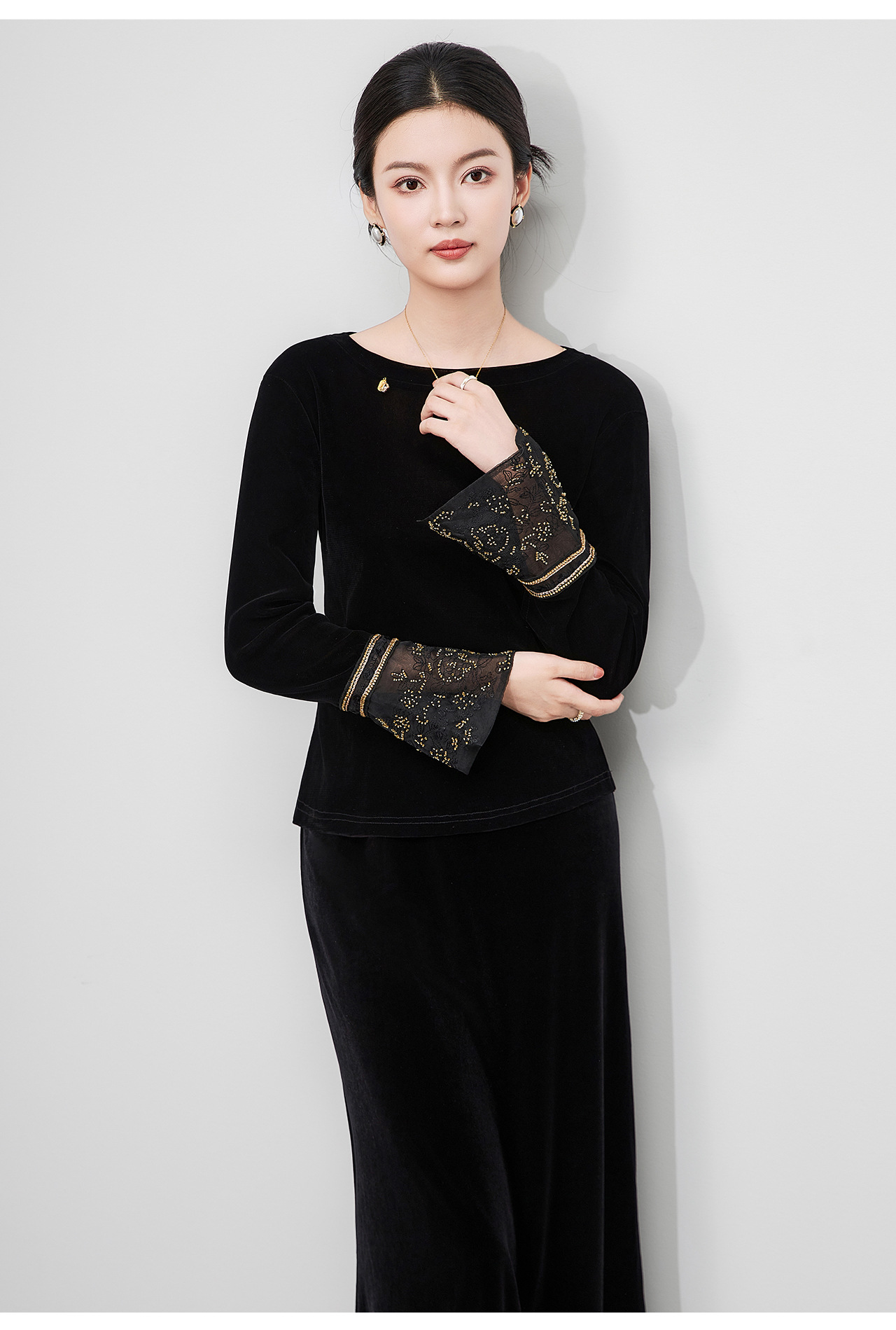 「高货wl」全新升级【铂金会员275/天猫369/差价94】(81126)洛诗琳复古丝绒打底衫2025秋冬钉珠刺绣欧根纱拼接上衣