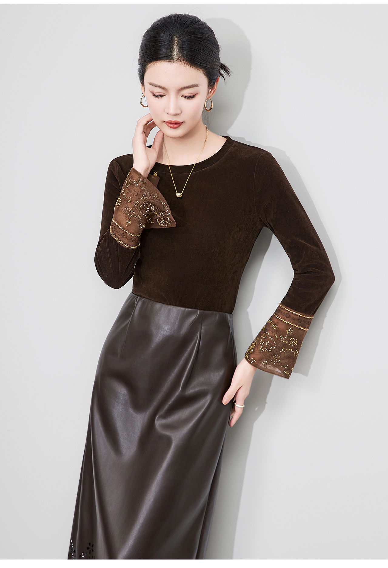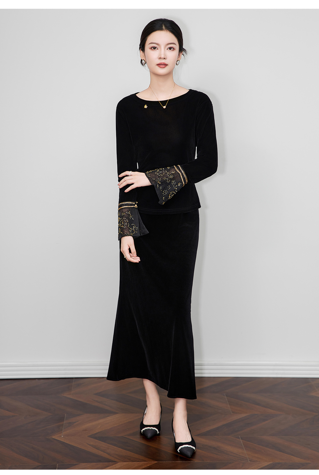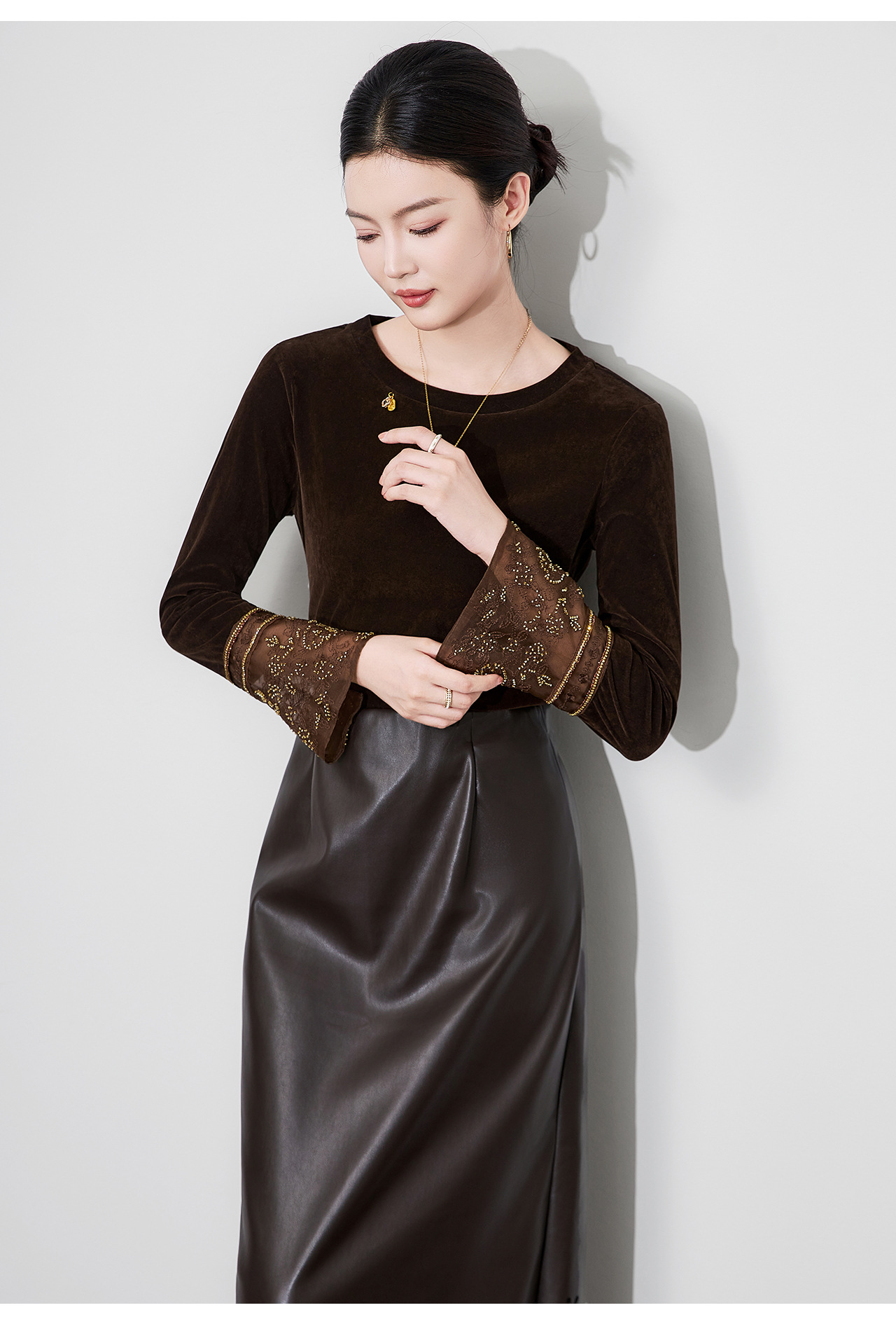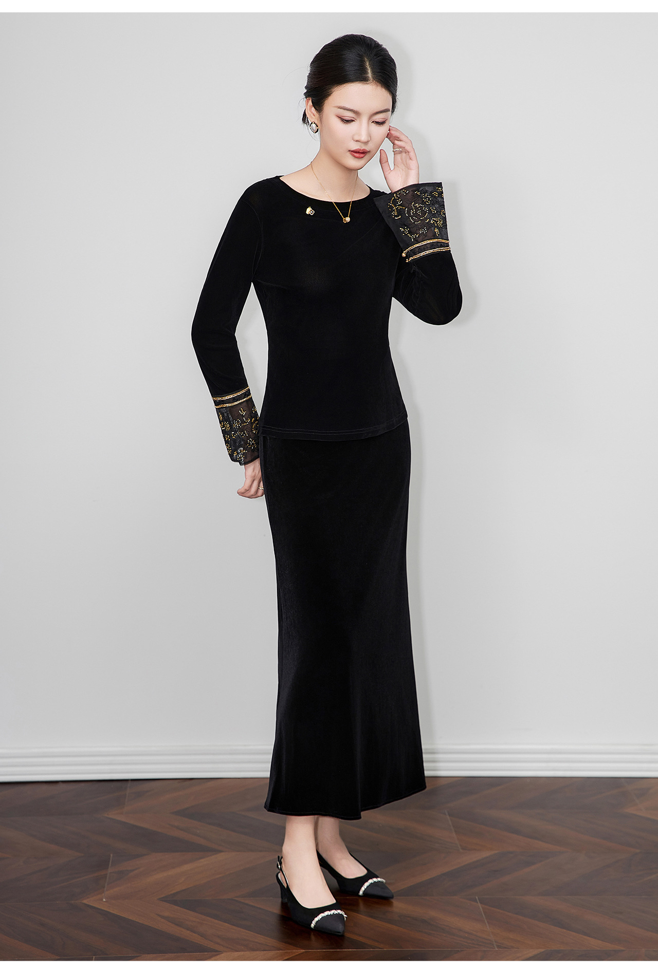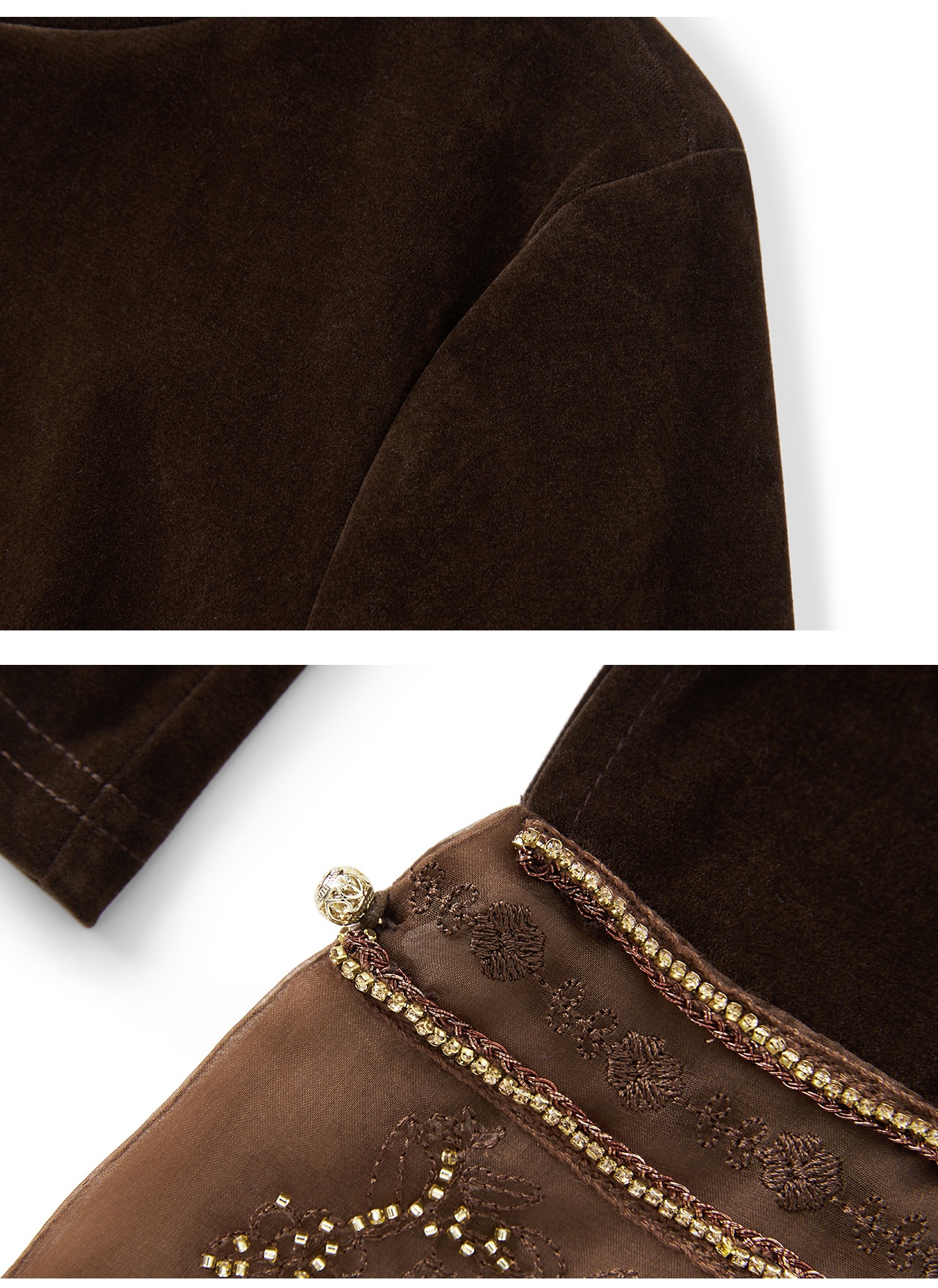 「高货wl」全新升级【铂金会员275/天猫369/差价94】(81126)洛诗琳复古丝绒打底衫2025秋冬钉珠刺绣欧根纱拼接上衣