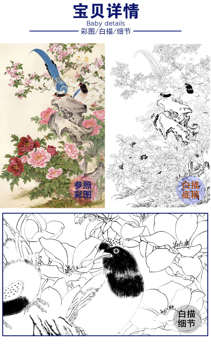 竖幅工笔花鸟白描底稿-牡丹-金鸿钧《春色满园》-多种白描尺寸可选-JR04