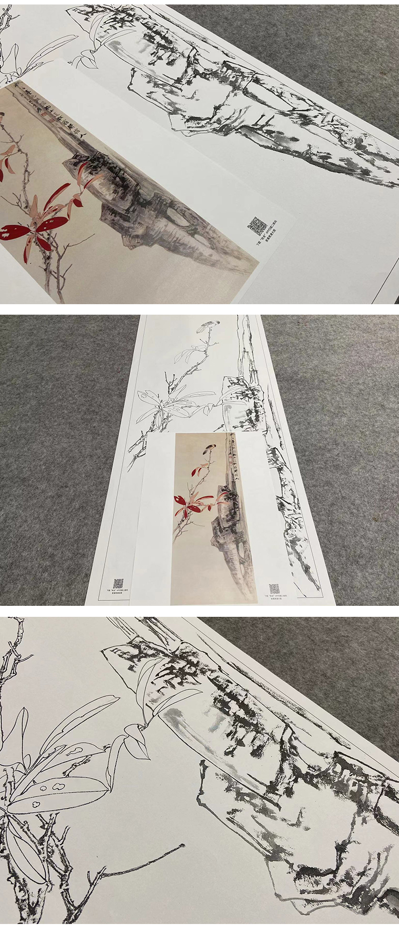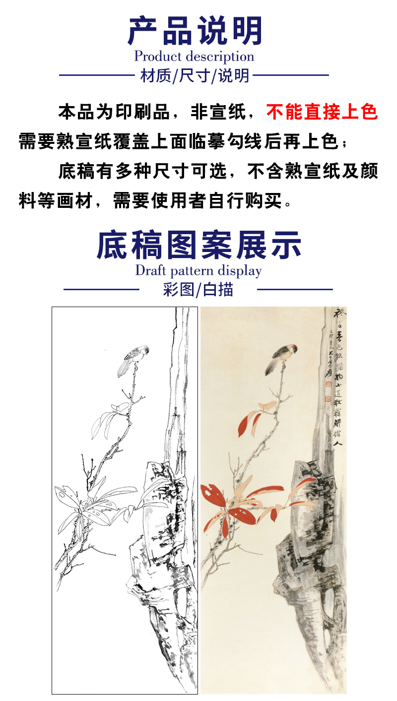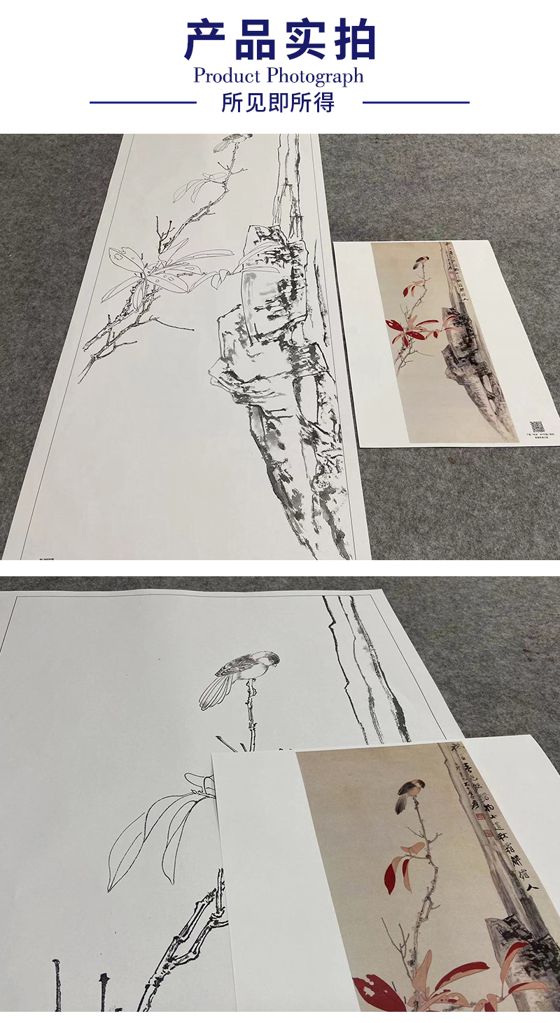 张大千竖幅工笔花鸟白描底稿-红叶小鸟-QD30