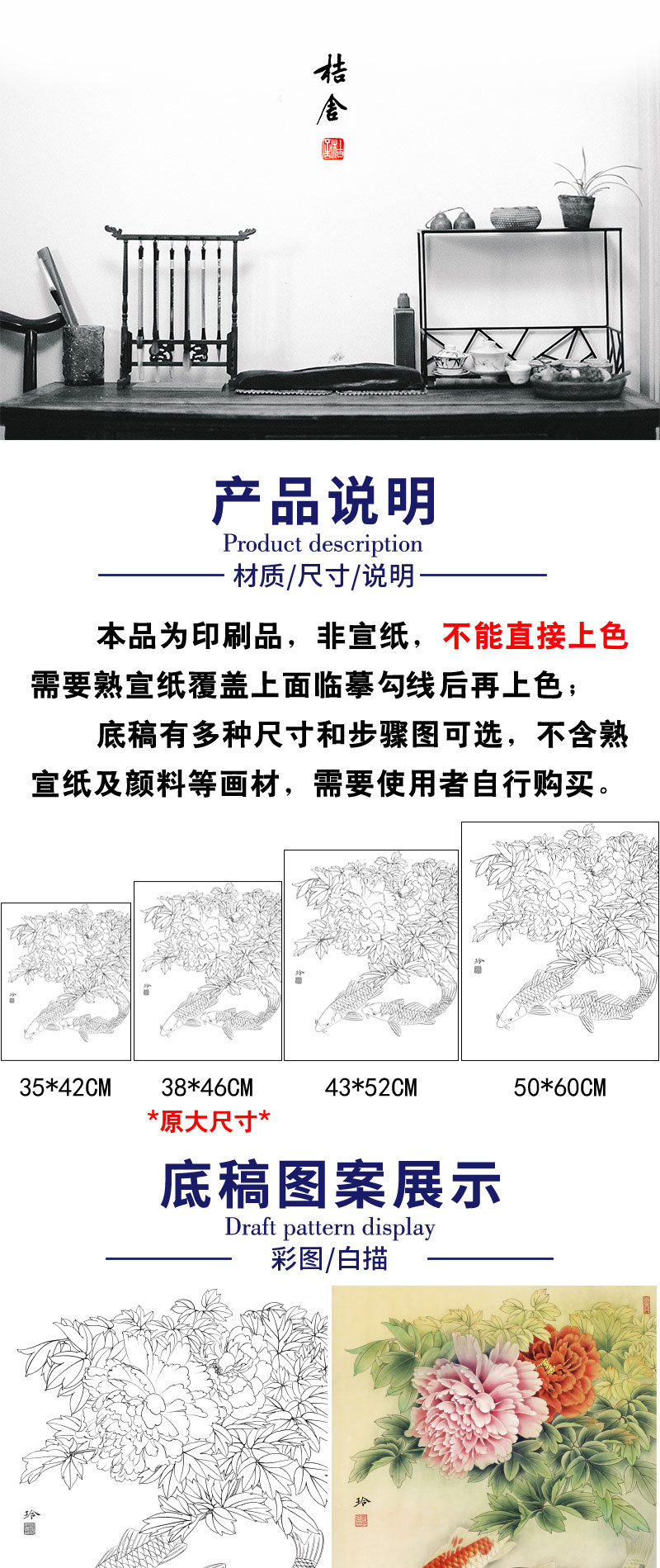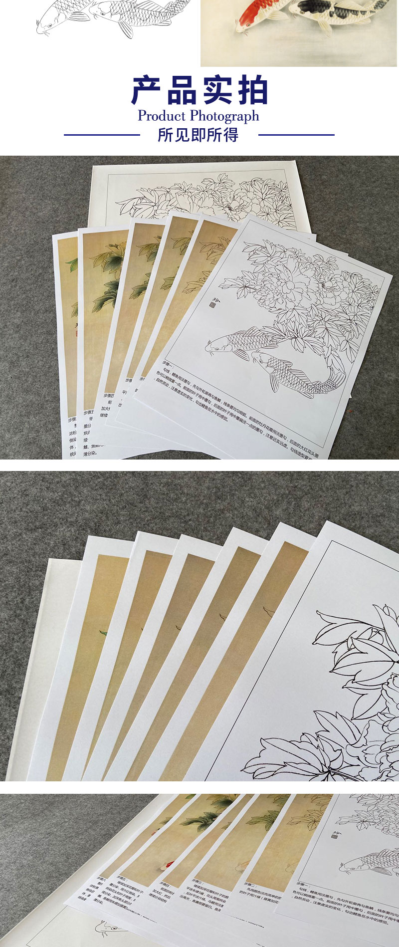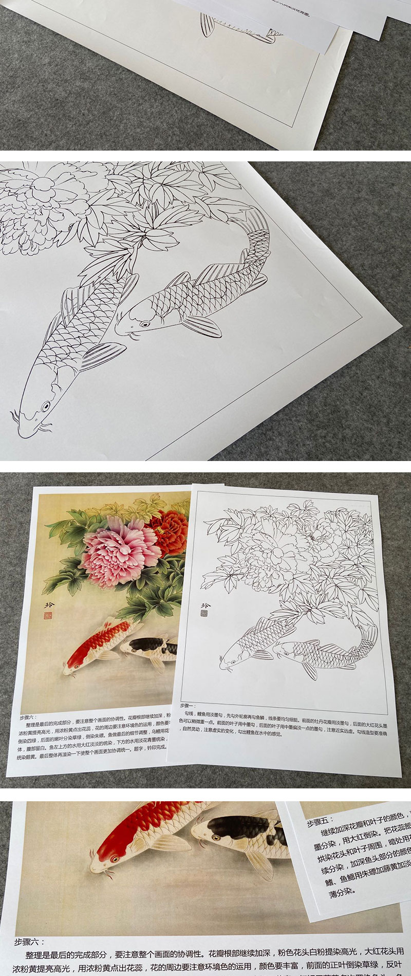 【有步骤、大彩图】郑玲玲工笔画白描底稿《吉庆有余图》牡丹鲤鱼初学者临摹花鸟线稿ZL42
