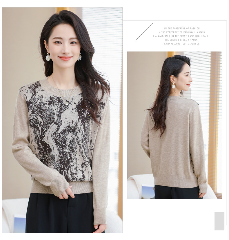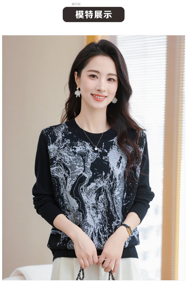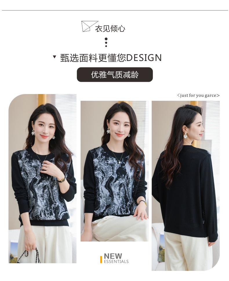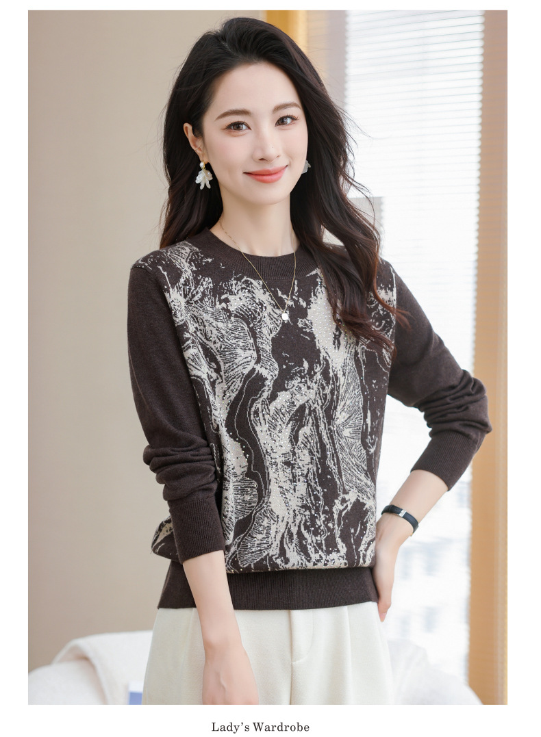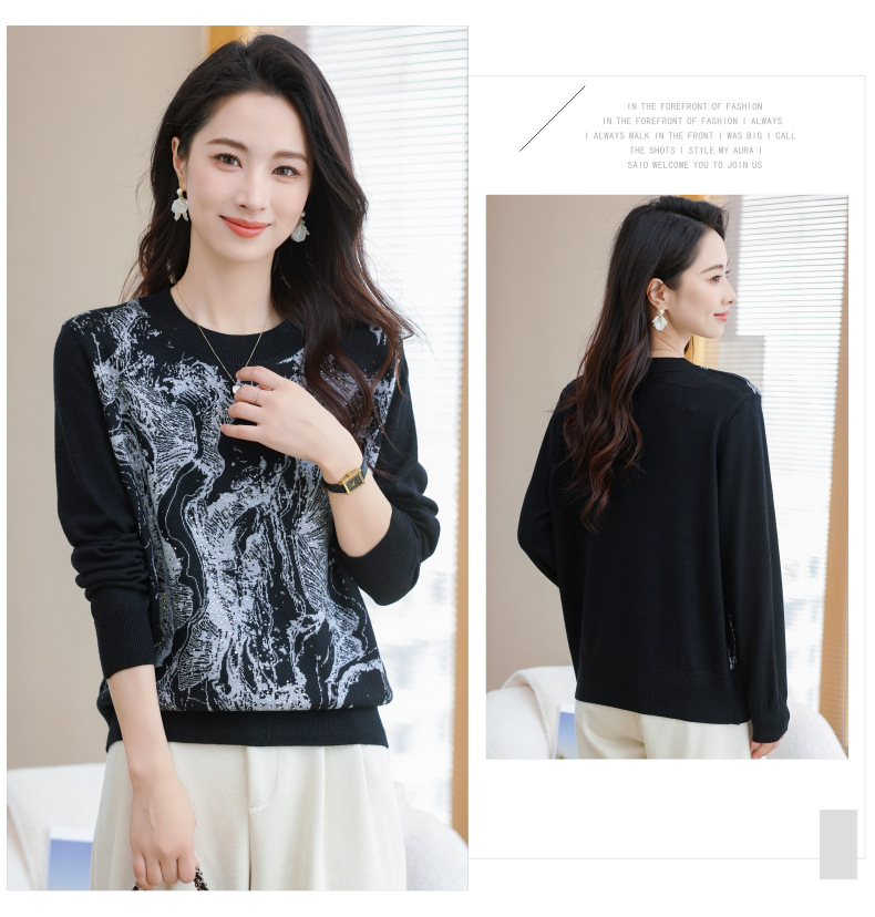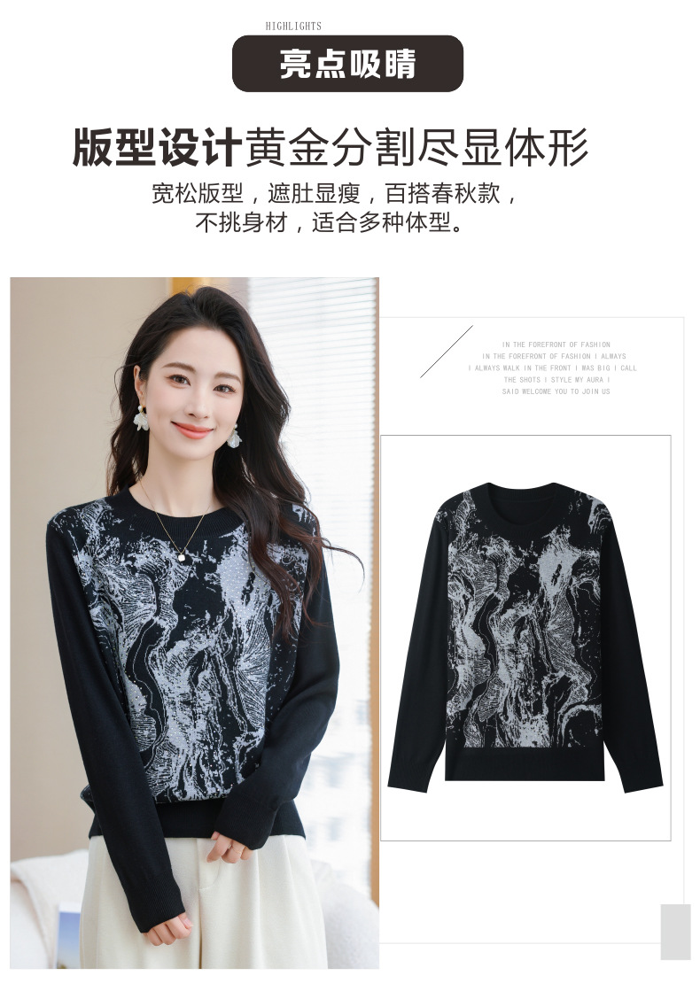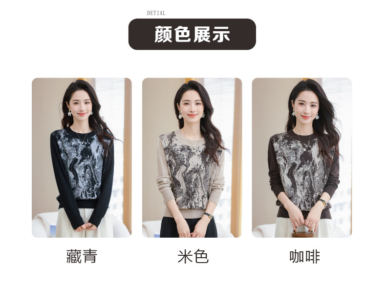 CC-28-1275复古印花羊毛针织衫秋季百搭显瘦休闲长袖圆领水墨画女士打底上衣