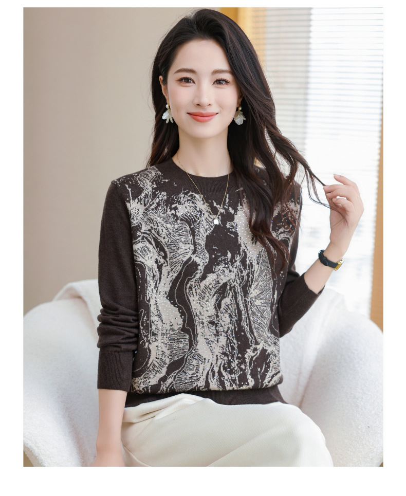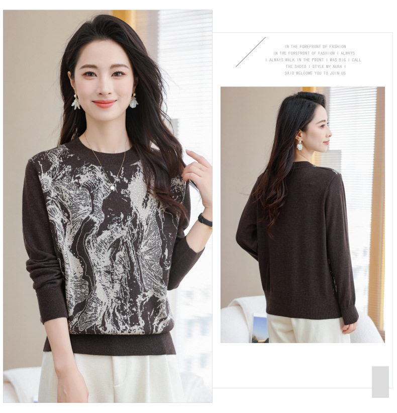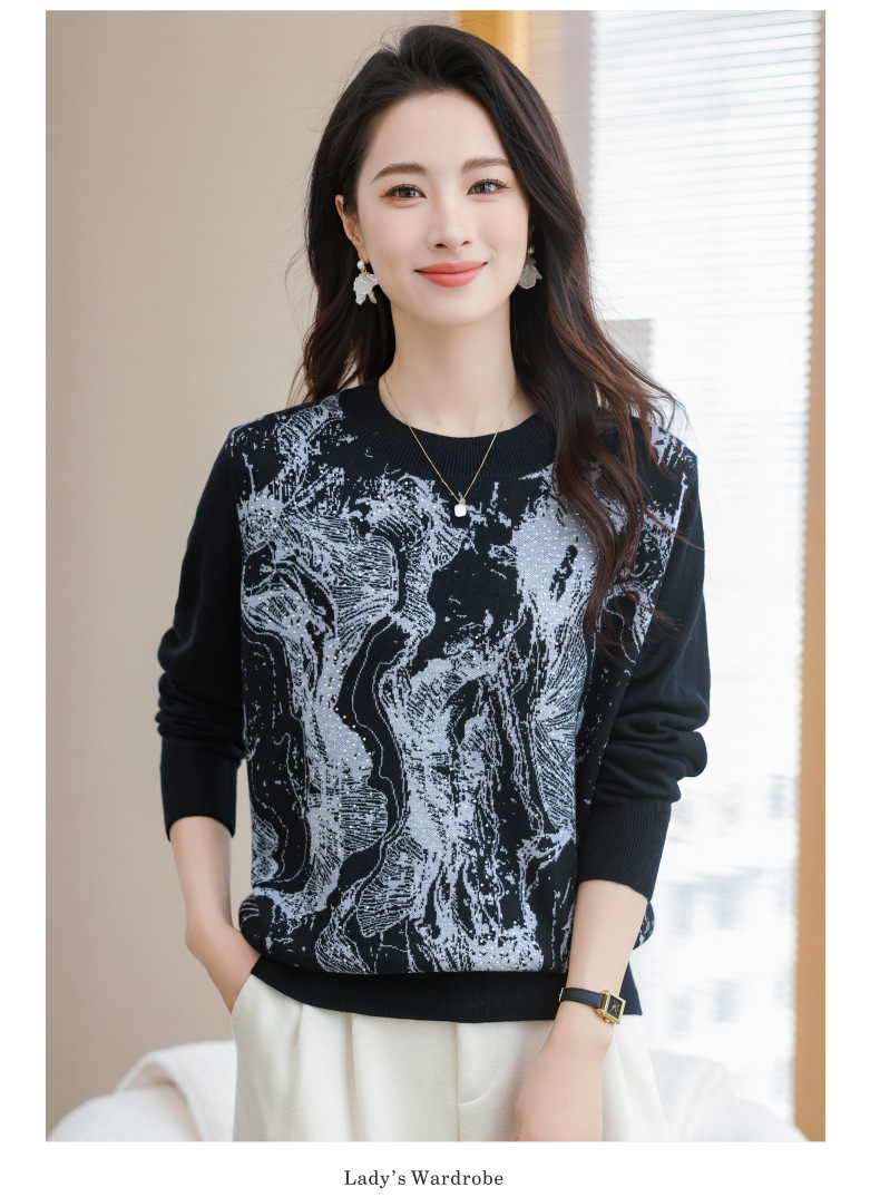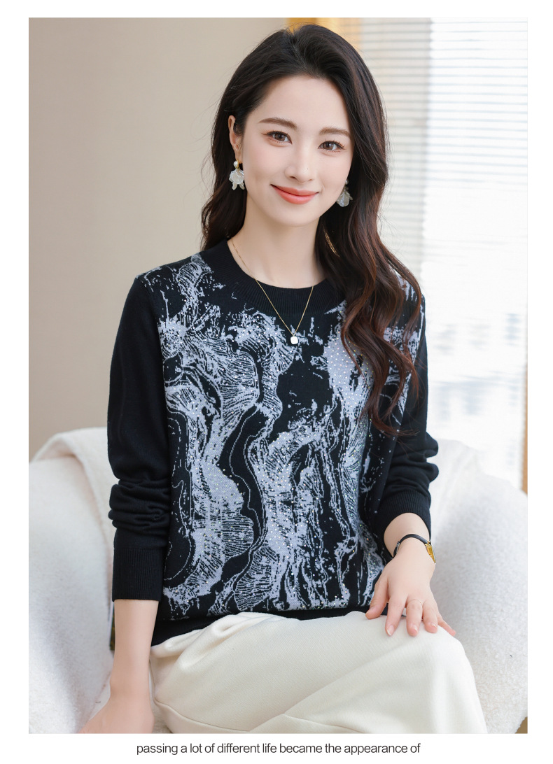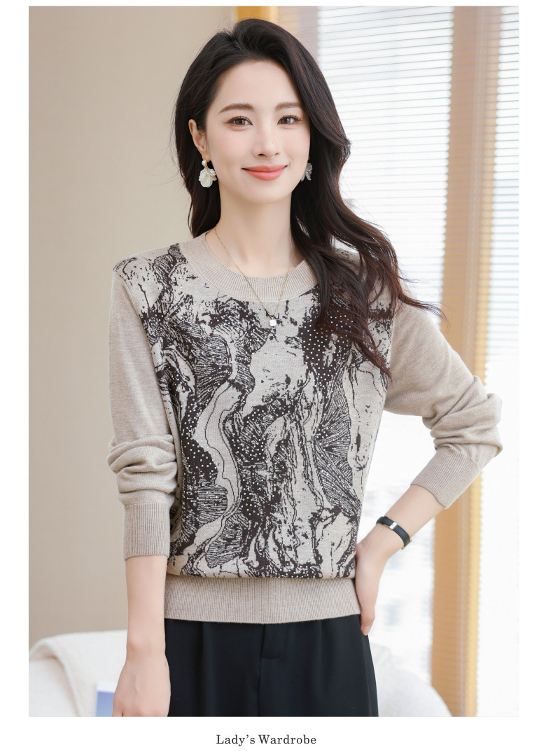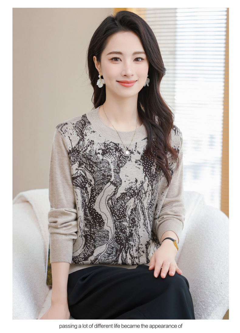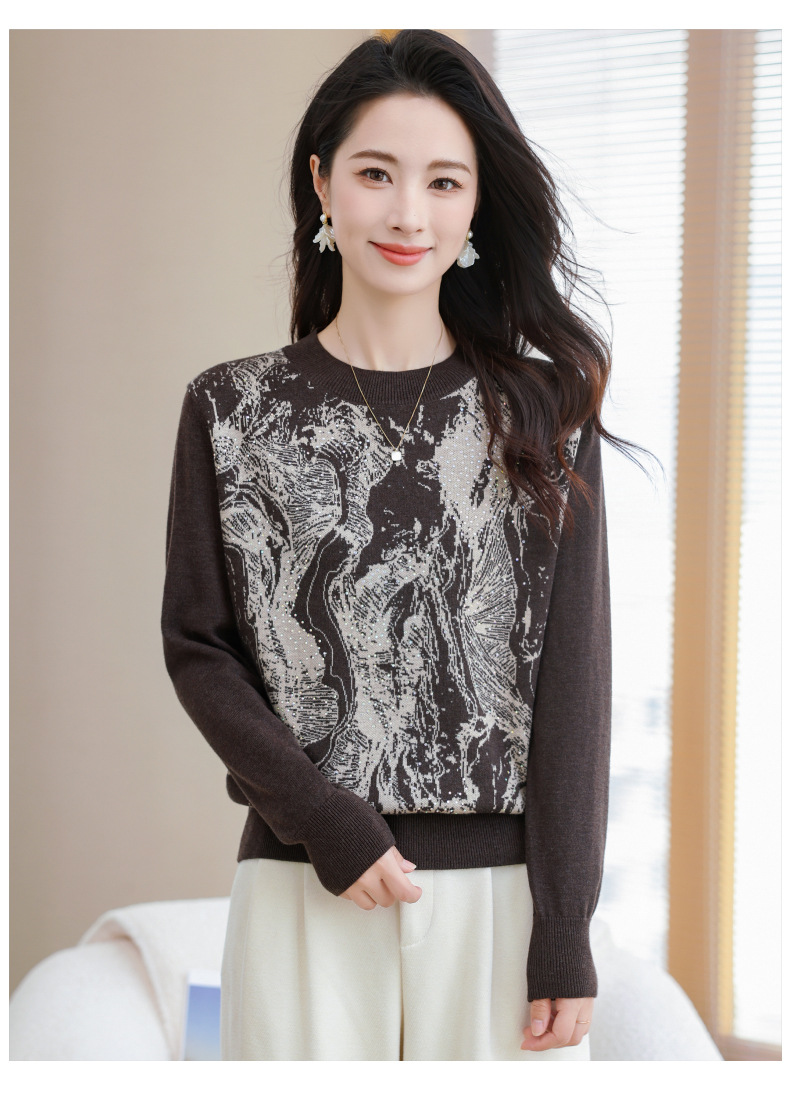 CC-28-1275复古印花羊毛针织衫秋季百搭显瘦休闲长袖圆领水墨画女士打底上衣