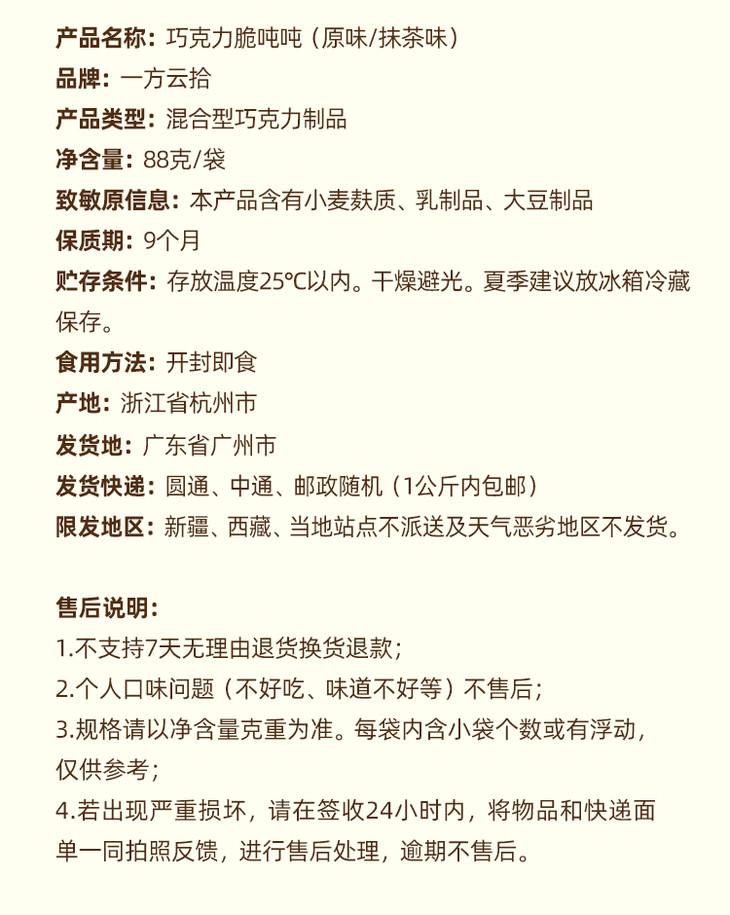 | 品名:巧克力脆吨吨 规格1:原味88g/袋*4袋 规格2:抹茶味88g/袋*4袋 规格3:88g/袋*4袋组合(原味*2+抹茶味*2) 规格4:88g/袋*2袋组合(原味*1+抹茶味*1);拍几份发几个包裹,不一定能同时到达,请耐心等待 发货地/产地:广州 包装方式:袋装 物流信息:默认中通/圆通/邮政快递,不支持指定快递 发货区域:新疆、西藏不发; 物流详情:周六、周日及节假日除外,正常48小时内发货,到货时间约为2~5天,请耐心等待 售后说明:收到货后有质量问题,在24小时内都可以拍照(坏品+快递单面箱子一起拍)上传,申请按坏品比例理赔或联系客服;生鲜食品性质特殊,不支持7天无理由退换货;饼干部分小碎,个人口味等不是售后标准,请理解; |