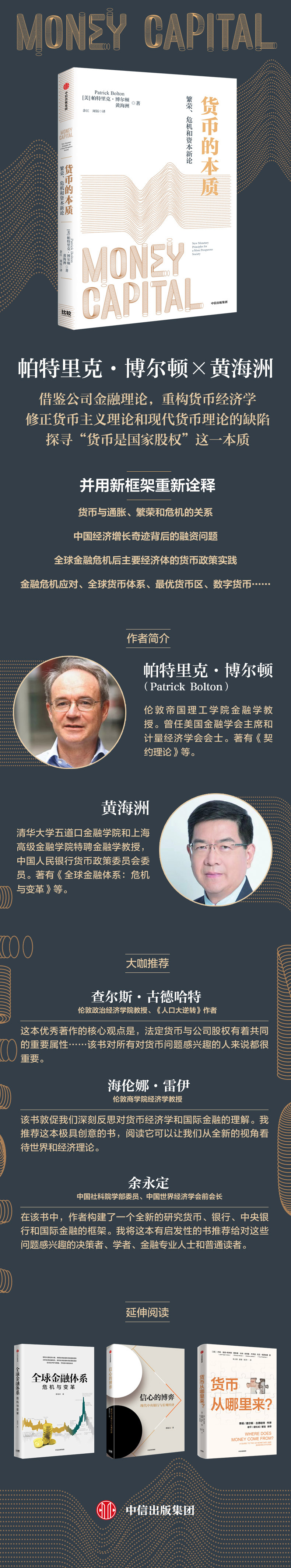 在本书中,著名经济学家帕特里克·博尔顿和黄海洲提供了一个新的视角,透过公司金融理论来重构货币经济学,构建了国家资本结构,将货币视为国家的股权。央行发行货币类似于公司发行股票,如果增发的货币没有用来支持高质量增长,增发货币会引起通胀;但如果货币增发不够,高质量增长难以获得足够的融资,经济增速则然放缓,甚至面临停滞和通缩。