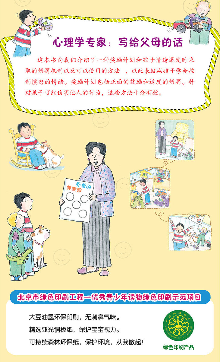 乔希生气时,他会扔玩具、破坏玩具,甚至打他的小弟弟。妈妈说,乔希应该学会用更好的方式来表达他愤怒的情绪。通过一张笑脸图,乔希开始用语言表达他的情绪,与他人相处融洽,他的脸上也出现了更多的笑容。 《儿童情绪管理与性格培养绘本?妈妈,我真的很生气:学会控制愤怒的情绪》为父母提供了一个简单有效的方法,帮助他们的孩子学会表达愤怒、受挫和其他难以处理的情绪,在“写给父母的话”中,心理学家弗吉尼亚·希勒探讨了探讨了通过奖励计划调整孩子愤怒情绪和行为的方法。
