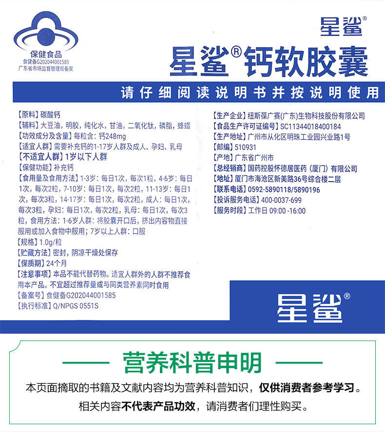 星鲨钙软胶囊/1份(5盒,单盒0.1g*12粒)生产日期:24年11月补单专用