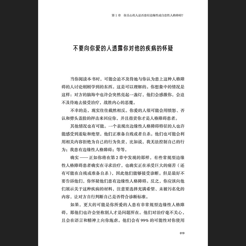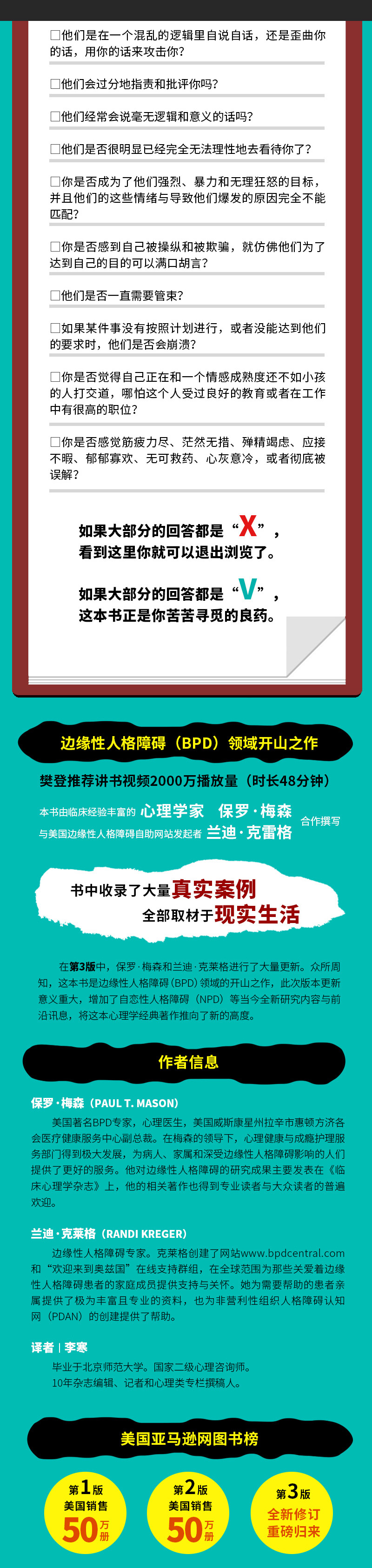 得益于作者与边缘性人格障碍患者及其亲友长期不断的合作,这本书中满是相处的智慧和技巧。很高兴看到作者在第3版中增加了有关自恋性人格障碍的内容,因为近年来我接触到很多需要对簿公堂才能结束的关系与冲突,在这些案例中的高冲突型人格者身上,都兼有自恋性人格障碍和边缘性人格障碍的典型表现。无论是亲朋好友、专业人士,或是(坦白地说)每一个人,都应该读读这本书,从而了解当下在我们身边的亲密关系中可能出现的种种出人意料、闻所未闻的奇葩行为,并学会如何应对。 ——比尔·埃迪 法学博士 社会工作者、律师、心理治疗师、调解员