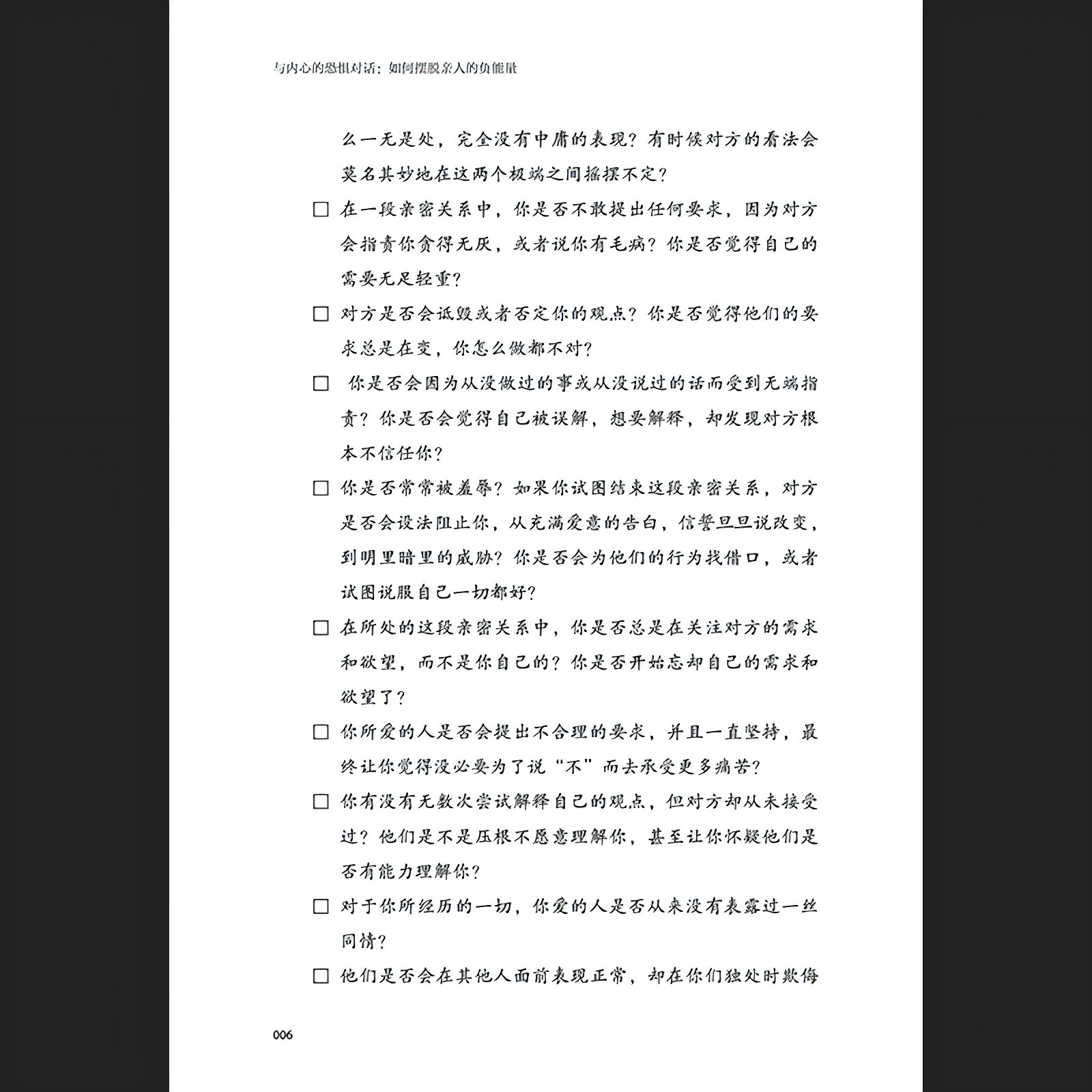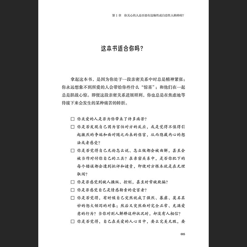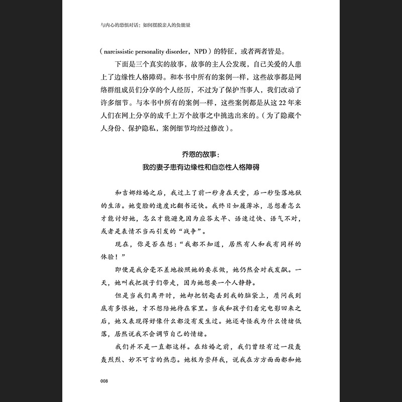 真是太不可思议了,《与内心的恐惧对话:如何摆脱亲人的负能量》不仅教会读者如何识别边缘性人格障碍的特征,还告诉读者,他们可以基于自己所需来选择自己想要的生活与亲密关系,而不是在疾病的控制下做出选择。