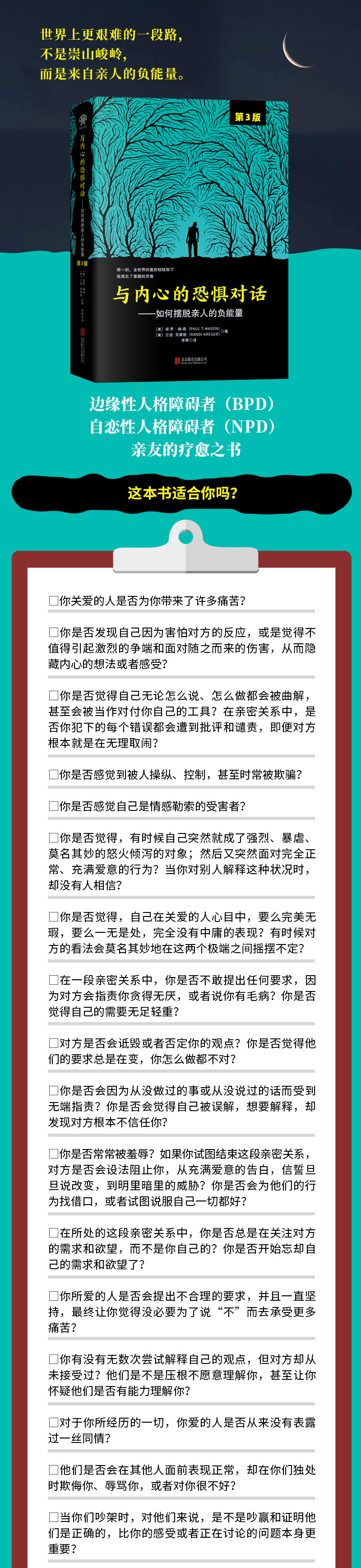 这本书恰好满足了当前社会的迫切需要——美国国立卫生研究院的研究表明,普通人中大约有6%会患上边缘性人格障碍。经常会有一些家庭向我索要有关边缘性人格障碍的资料,而几乎每一次我都会推荐《与内心的恐惧对话:如何摆脱亲人的负能量》这本书。本书的第2版真的是非常通俗易懂,加入了更多有用的小技巧,去帮助那些面对困境的家庭。