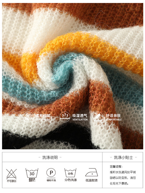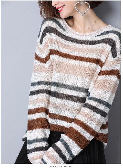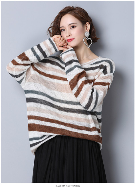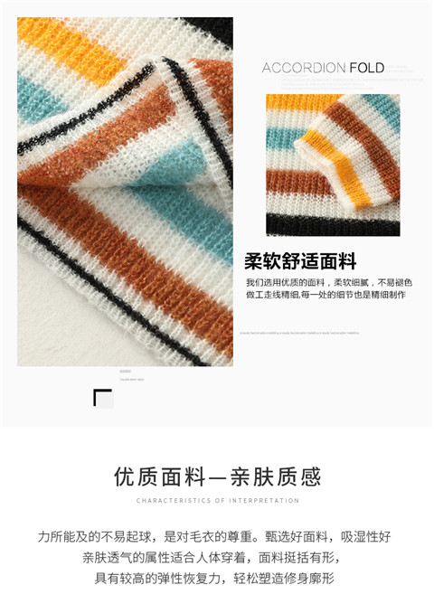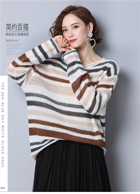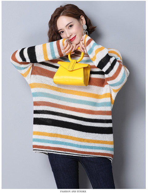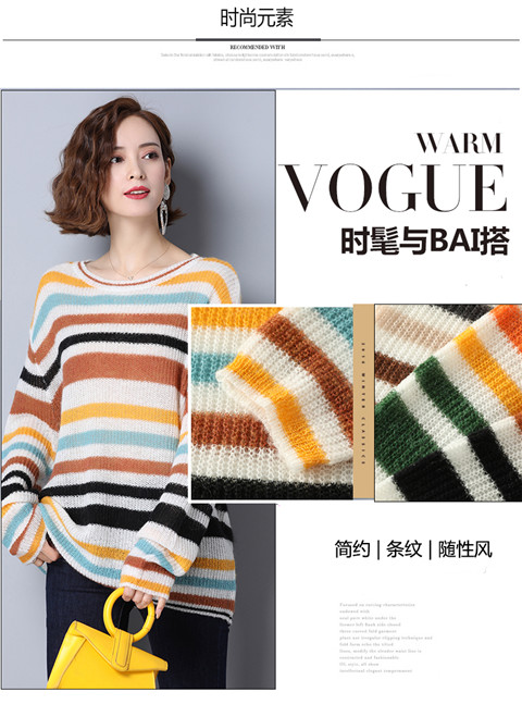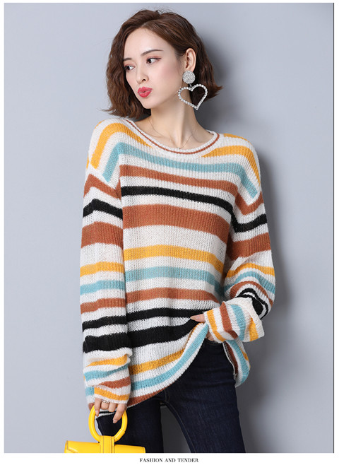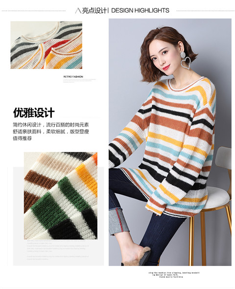 上海旗袍厂PY-30555 秋冬新款彩色条纹圆领套头女毛衣中长款宽松时尚休闲百搭针织衫