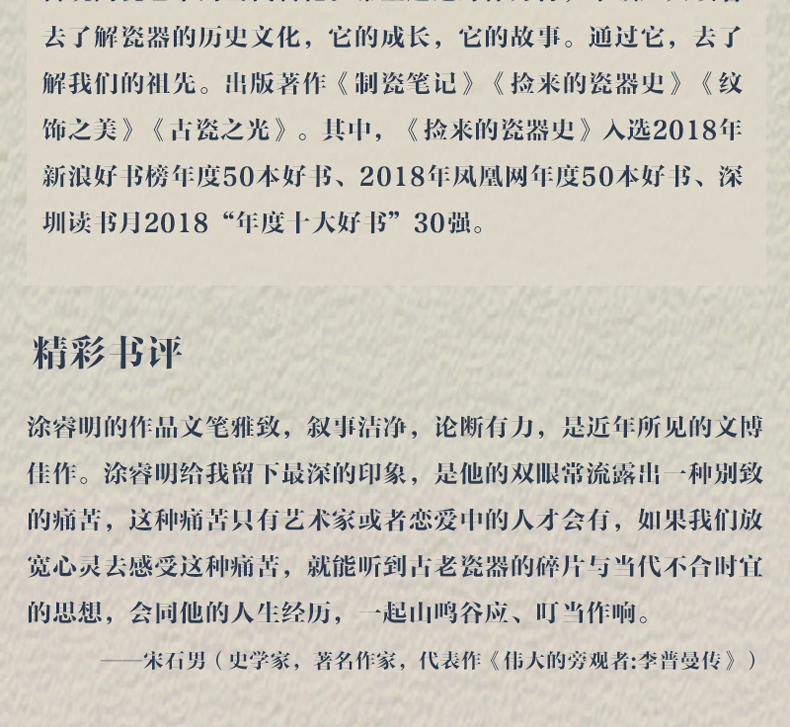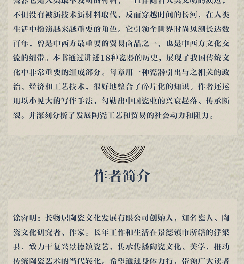 涂睿明:长物居陶瓷文化发展有限公司创始人,知名瓷人、陶瓷文化研究者、作家。长年工作和生活在景德镇市所辖的浮梁县,致力于复兴景德镇瓷艺,传承传播陶瓷文化、美学,推动传统陶瓷艺术的当代转化。希望通过身体力行,带领广大读者去了解瓷器的历史文化,它的成长,它的故事。通过它,去了解我们的祖先。出版著作《制瓷笔记》《捡来的瓷器史》《纹饰之美》《古瓷之光》。其中,《捡来的瓷器史》入选2018年新浪好书榜年度50本好书、2018年凤凰网年度50本好书、深圳读书月2018“年度十大好书”30强。