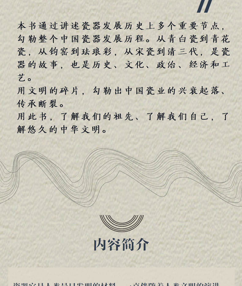 本书通过讲述瓷器发展历史上多个重要节点,勾勒整个中国瓷器发展历程。从青白瓷到青花瓷,从钧窑到珐琅彩,从宋瓷到清三代,是瓷器的故事,也是历史、文化、政治、经济和工艺。
