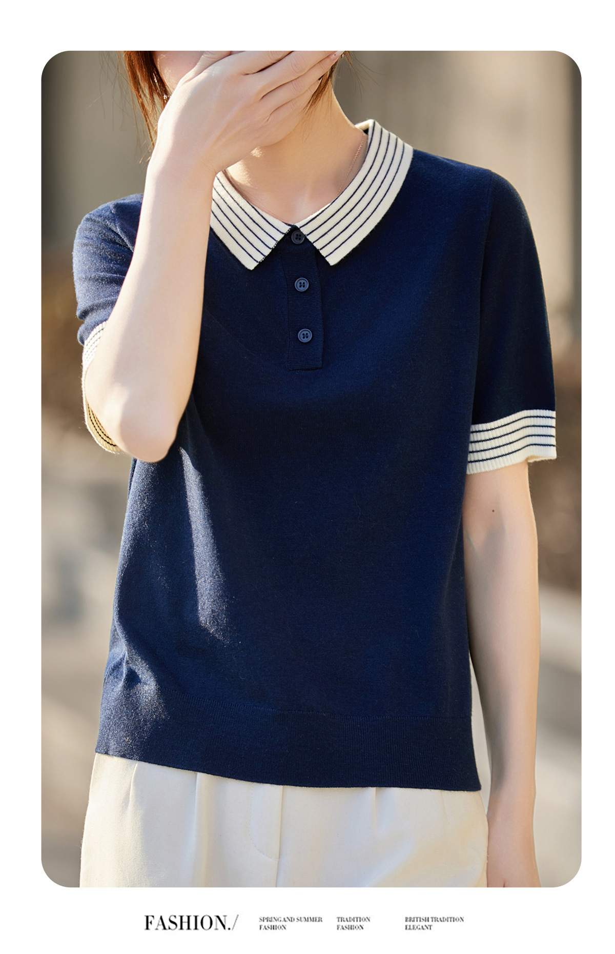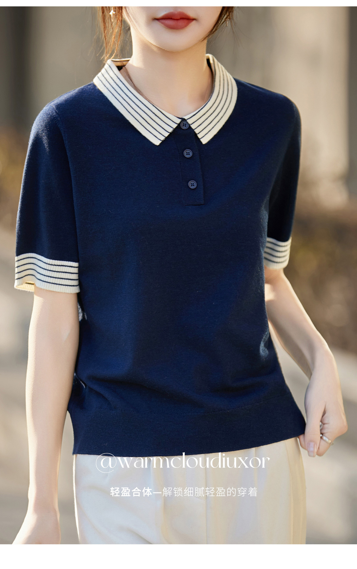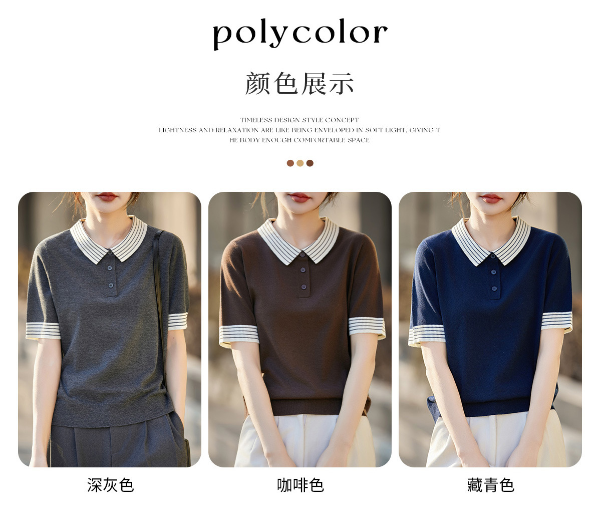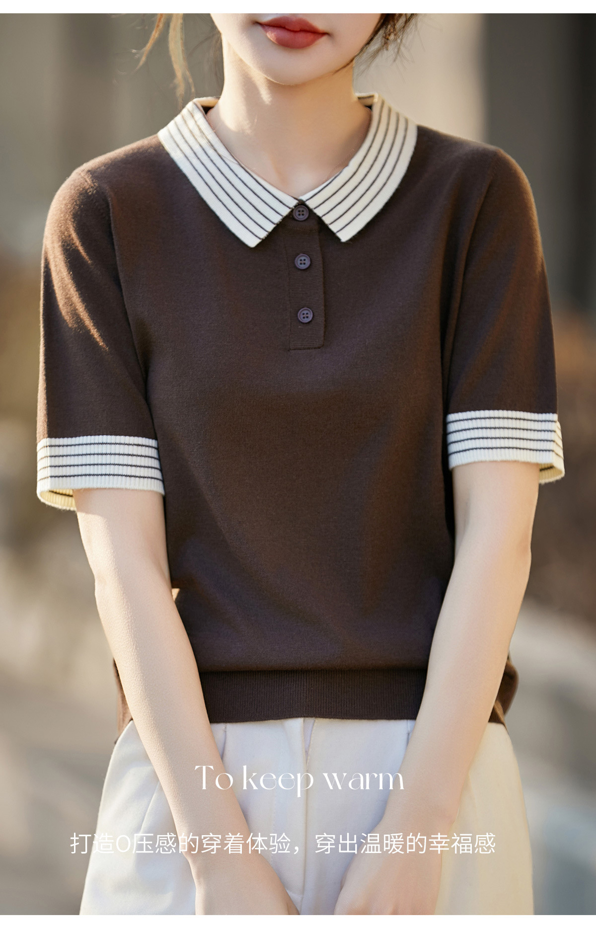 百媚生 蚕丝羊毛POLO领撞色短袖针织衫薄款上衣女PY-6610-53