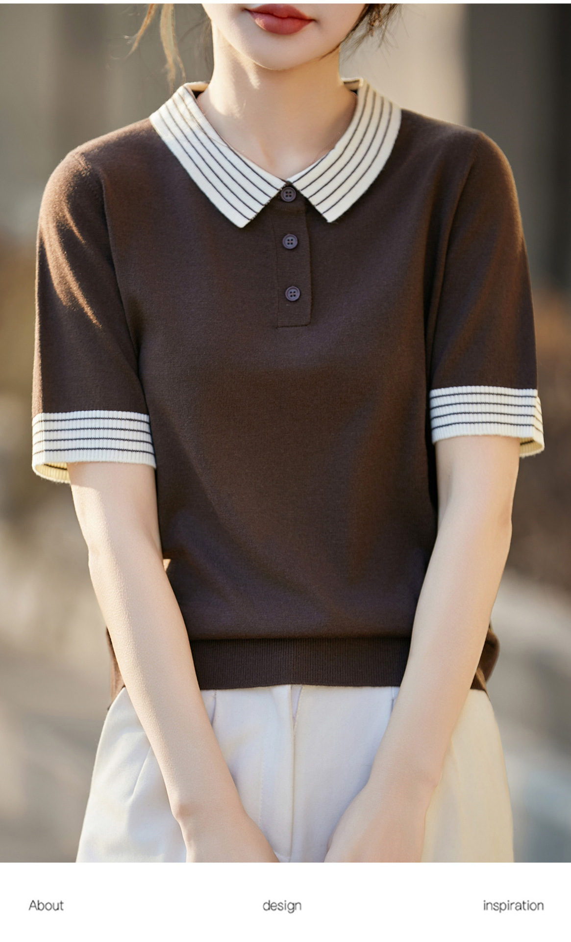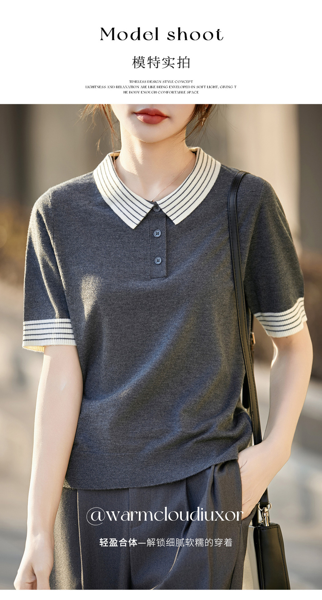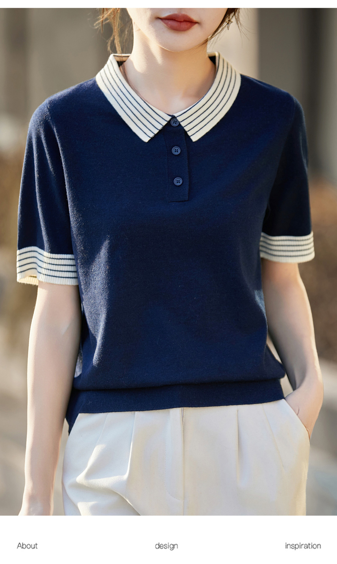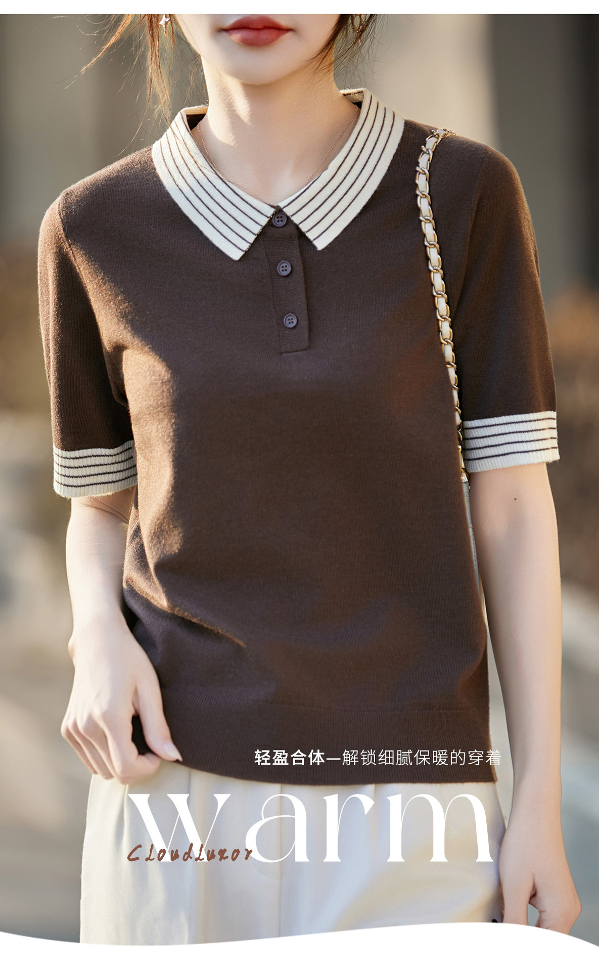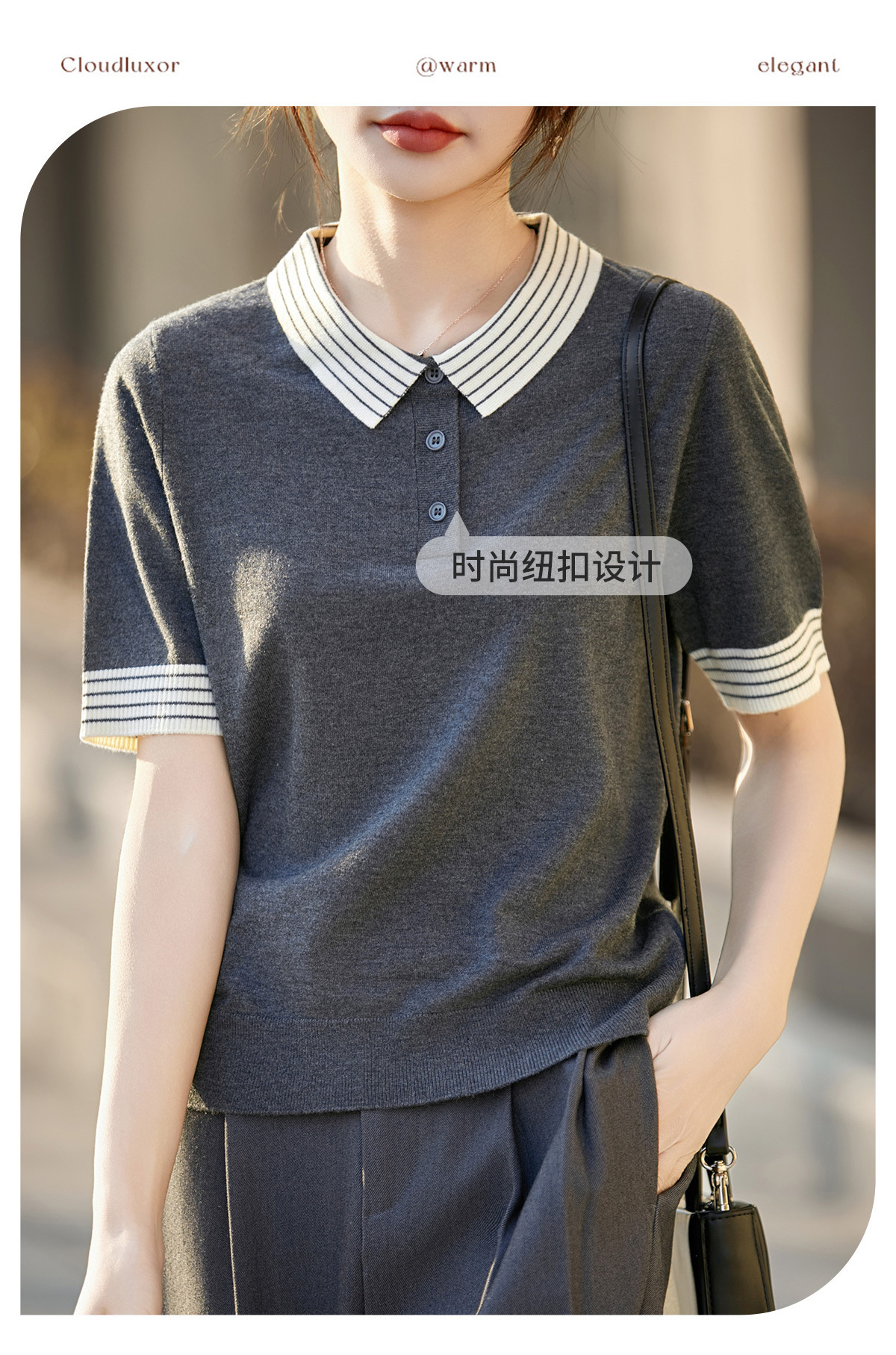百媚生 蚕丝羊毛POLO领撞色短袖针织衫薄款上衣女PY-6610-53