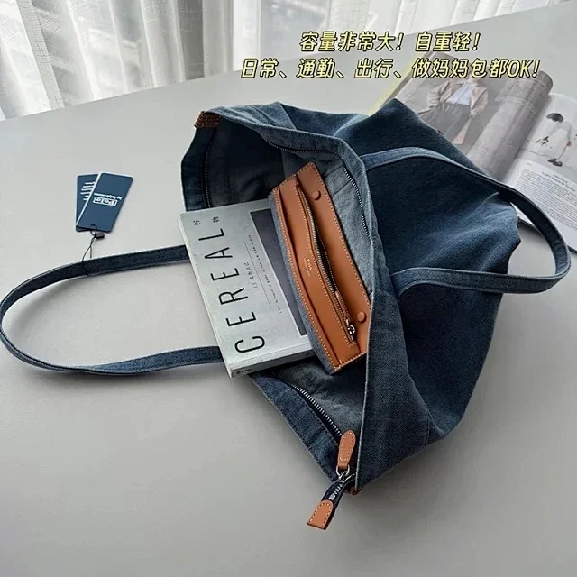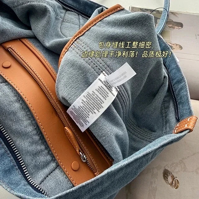 主体采用水洗牛仔布,呈现自然的做旧质感与柔软触感,搭配侧边的仿皮拼接,提升了整体的精致度与耐用性。提手同材质牛仔布,结实耐用不易变形。