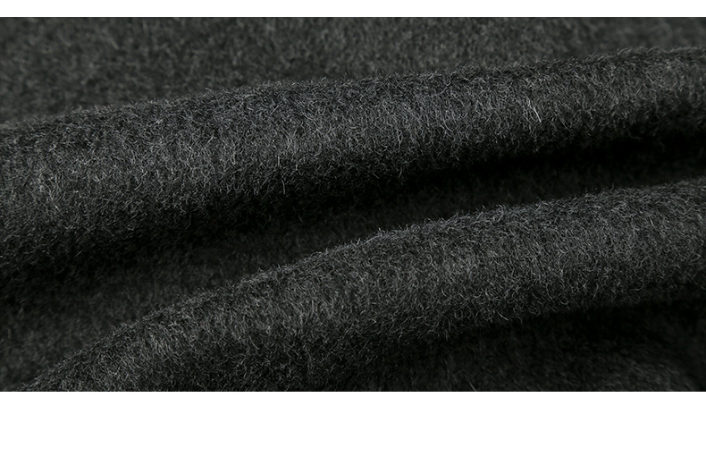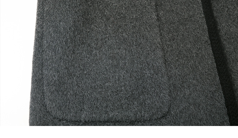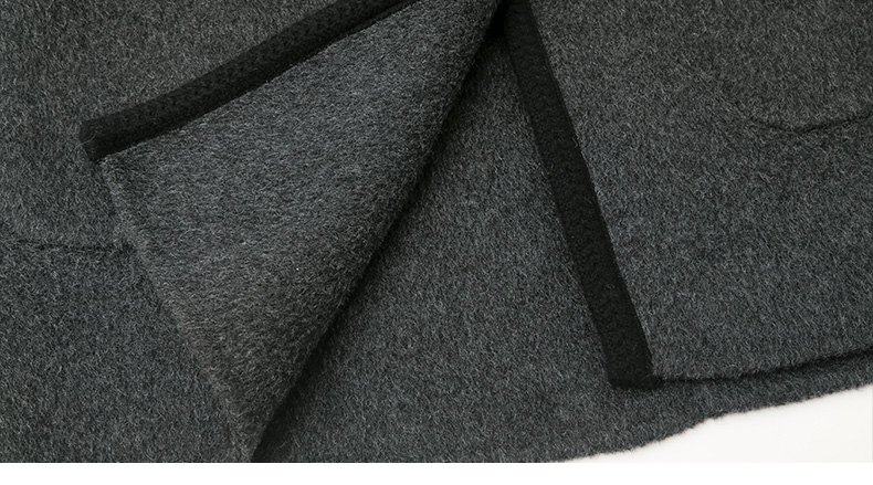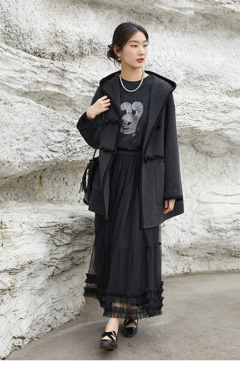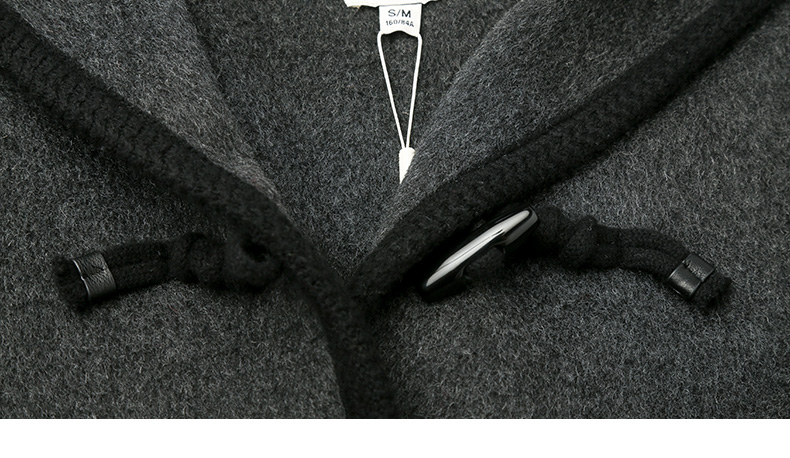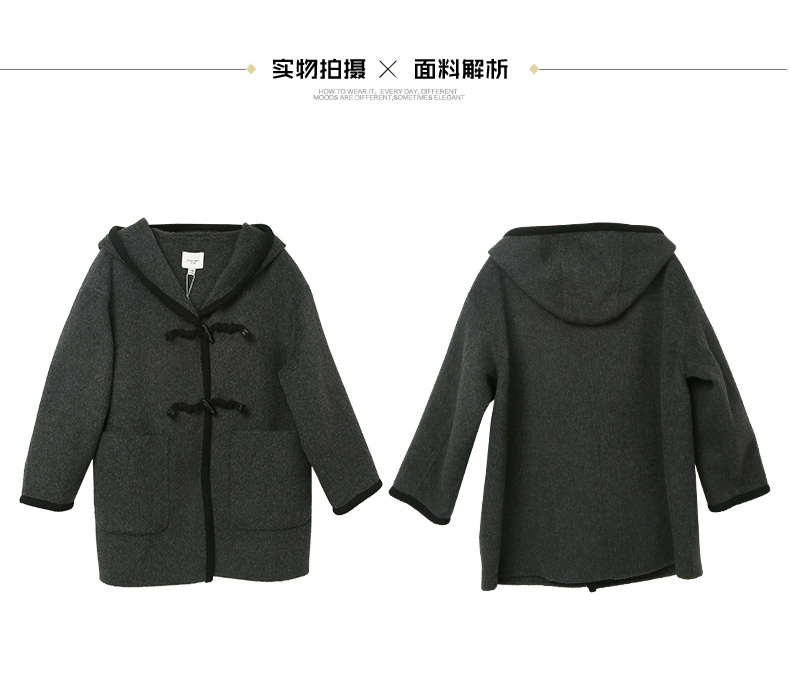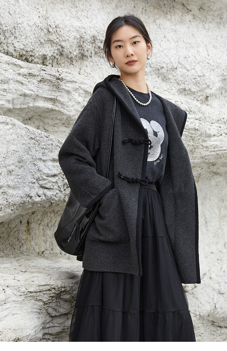 2025 秋冬深灰色连帽牛角扣毛呢大衣女 撞色包边宽松中长款休闲学院风保暖呢子外套