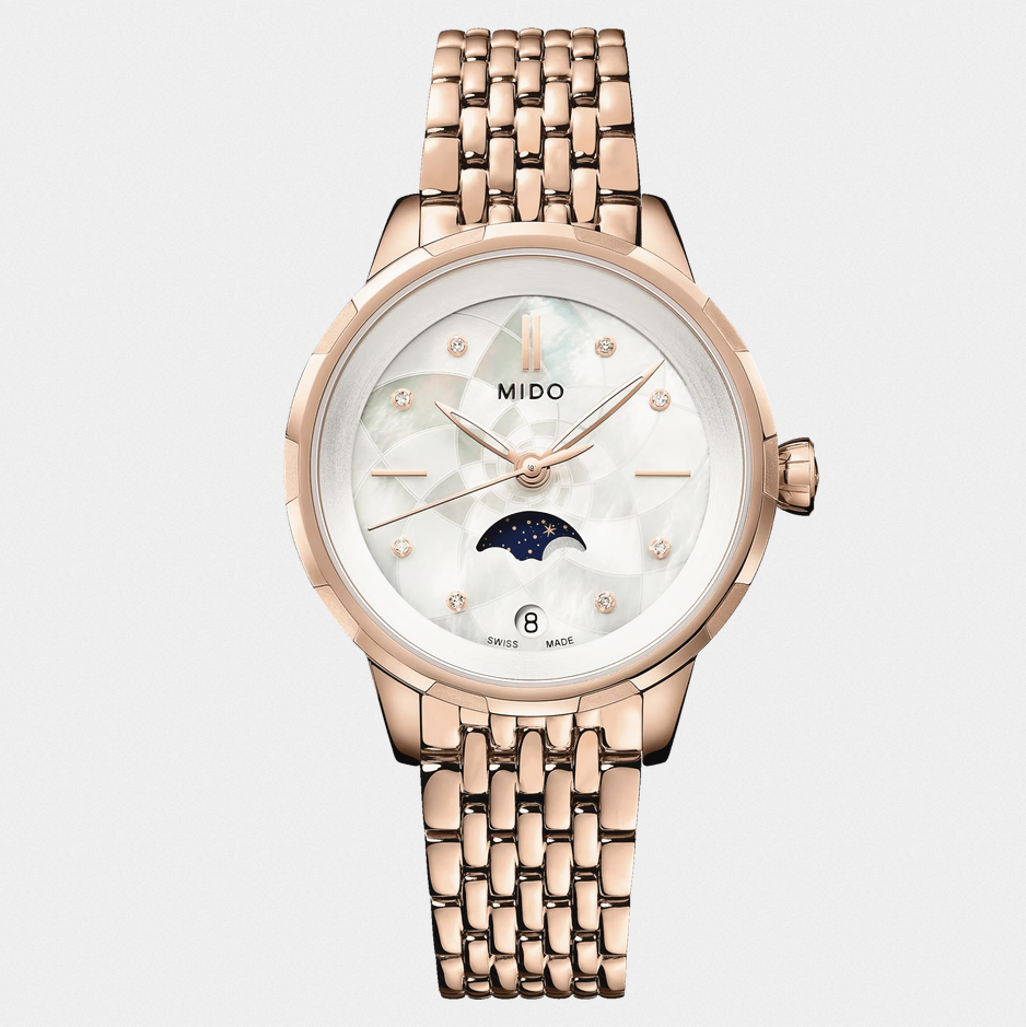 镜面 材质 | 蓝宝石水晶玻璃 | 表盘 | PVD镀玫瑰金不锈钢表壳 白色珍珠贝母表盘,抛光镀玫瑰金不锈钢刻度,8颗真钻作为刻度装饰,日期窗及月相指示器位于6点钟位置。钻石抛光秒针,镂空时针和分针。 日期 月相显示 密底 |