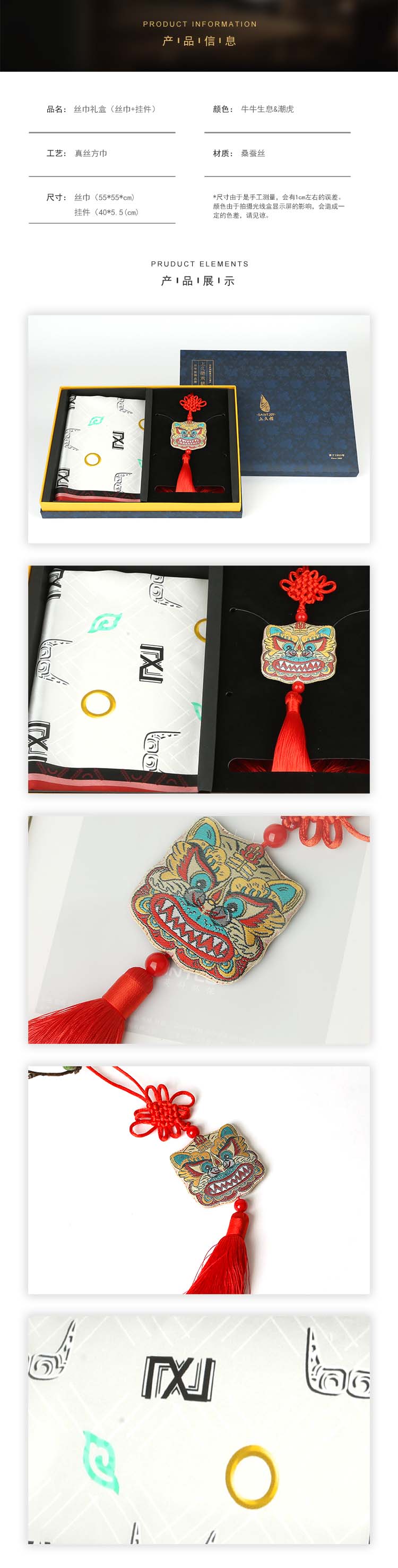 SAINTJOY/上久楷宋锦潮虎挂件真丝小方巾牛牛生息