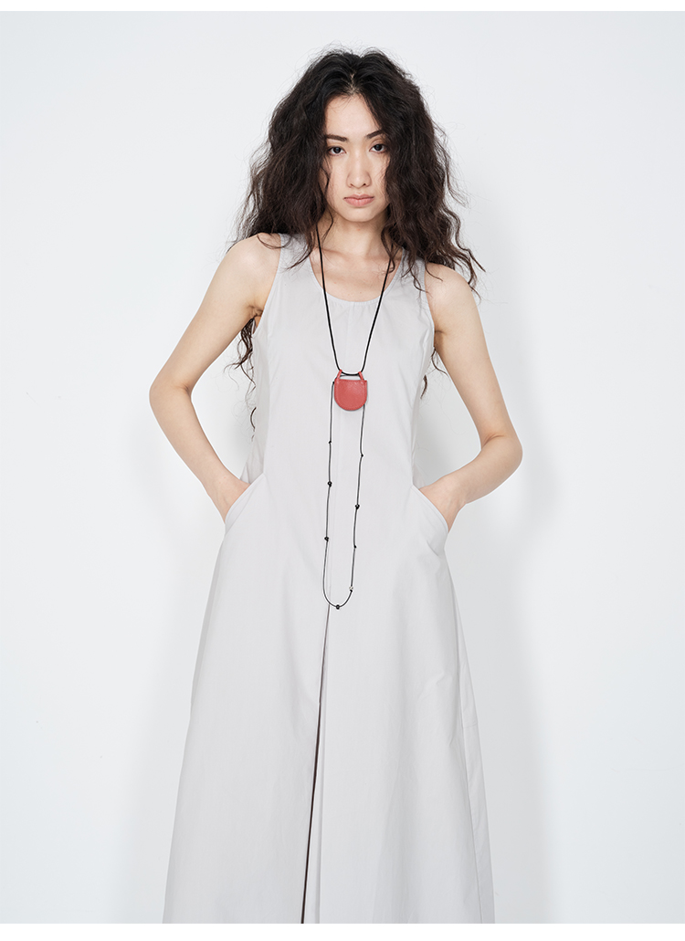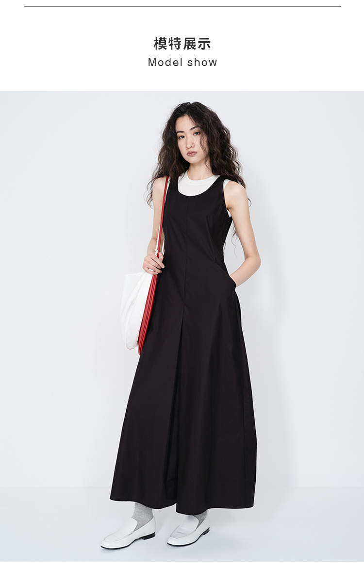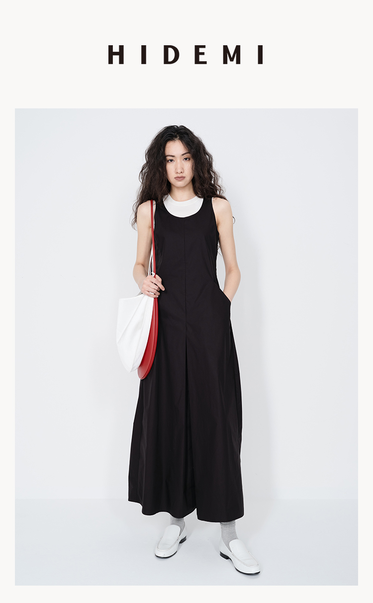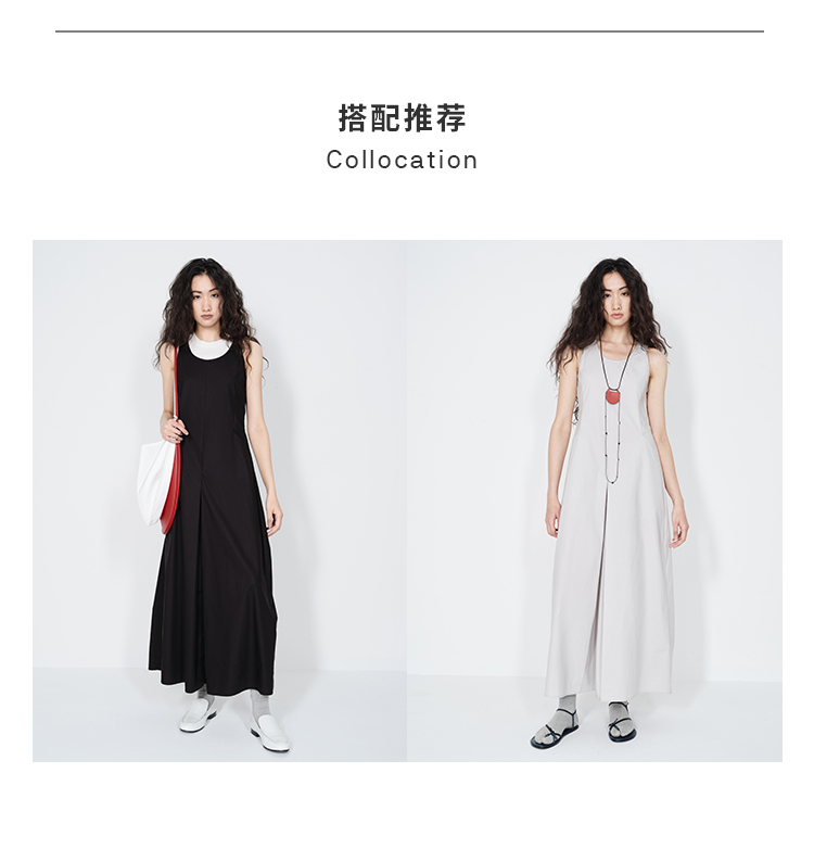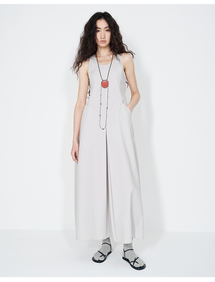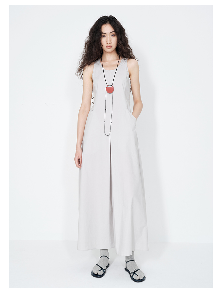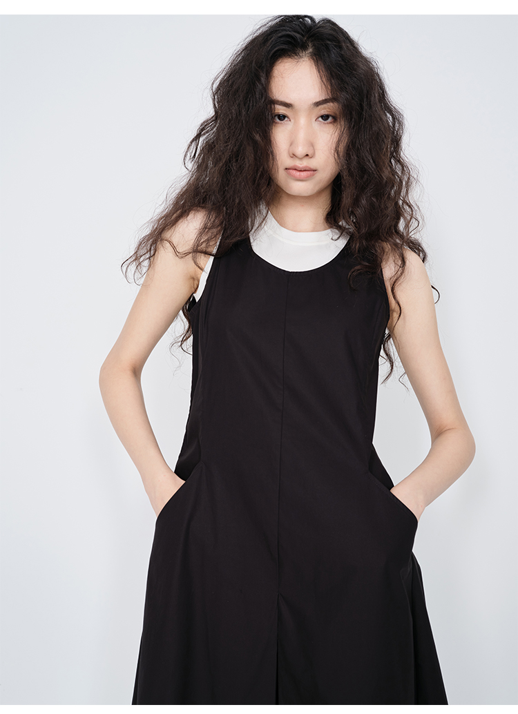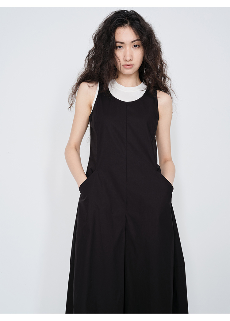 HIDEMI 极简设计感圆领压褶水洗棉口袋茧型廓形连衣裙 海鸥灰/黑色