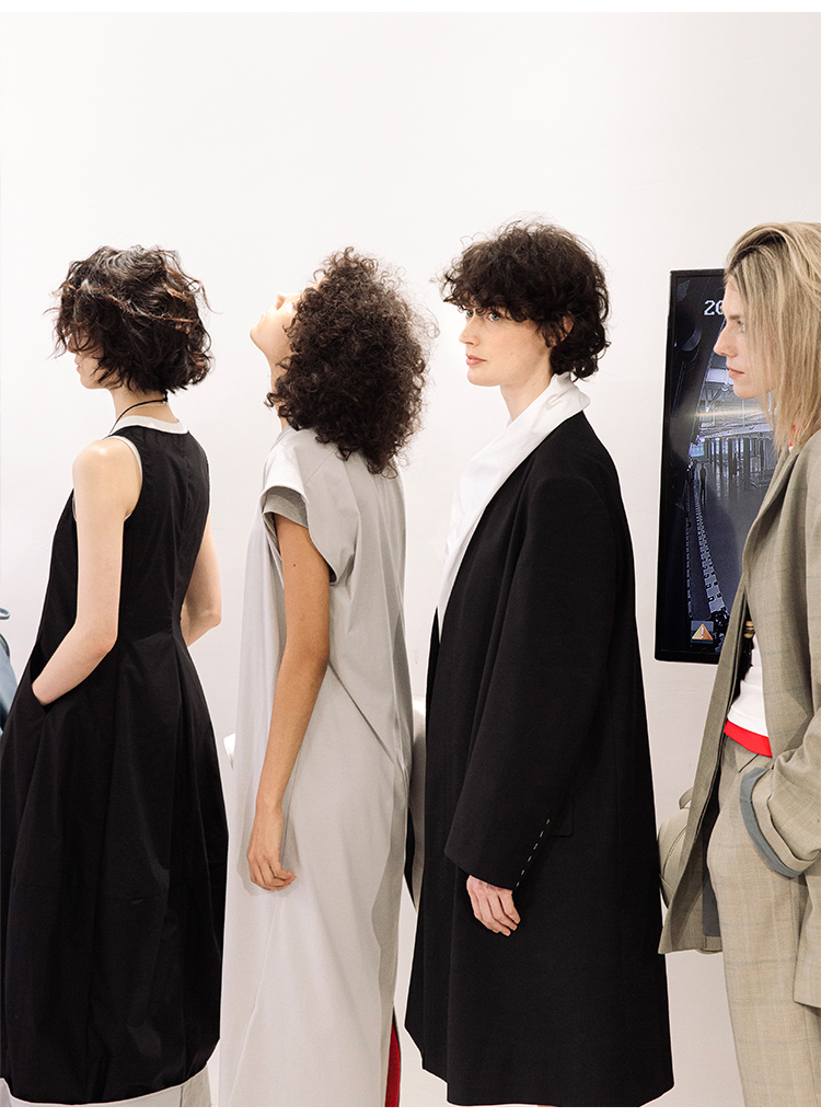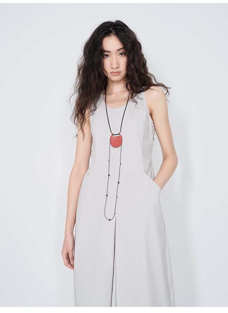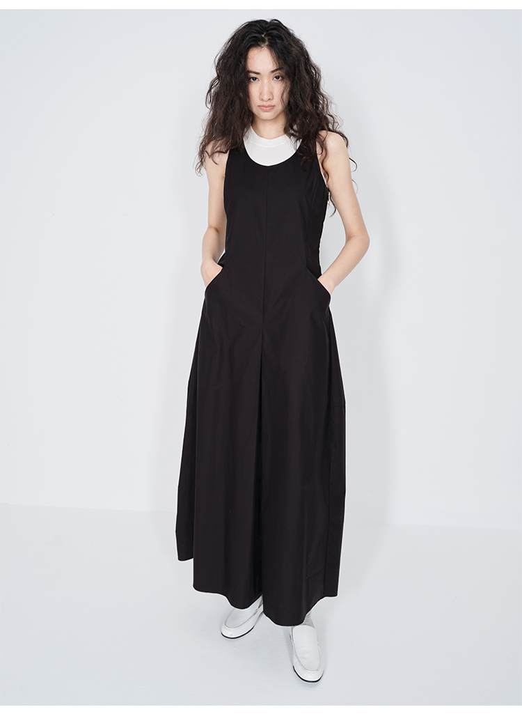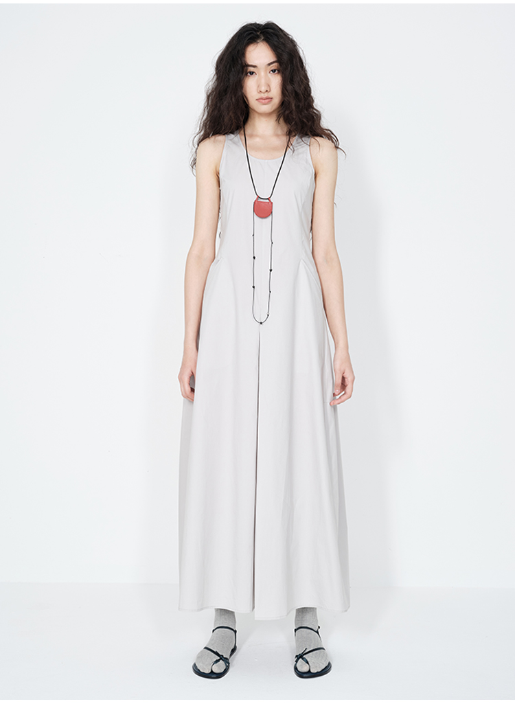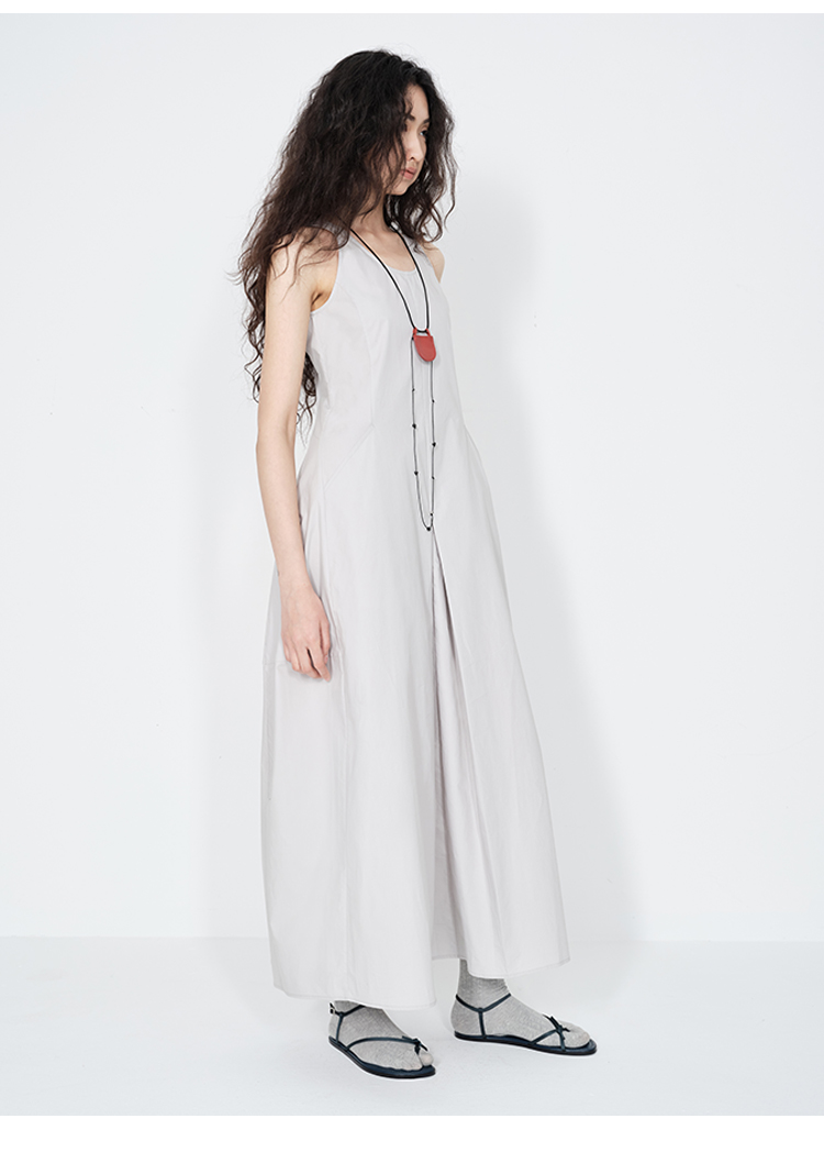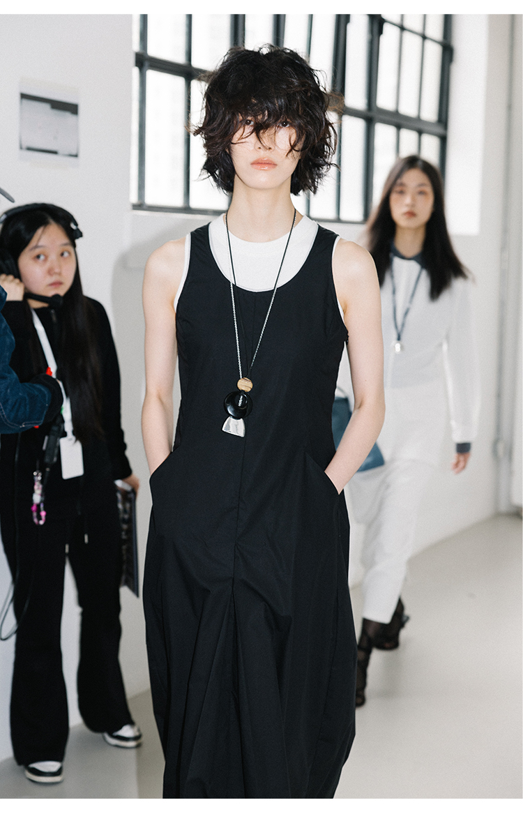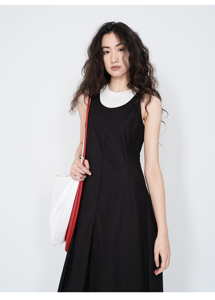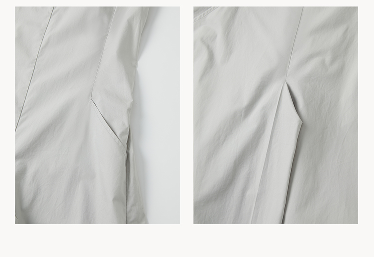 HIDEMI 极简设计感圆领压褶水洗棉口袋茧型廓形连衣裙 海鸥灰/黑色