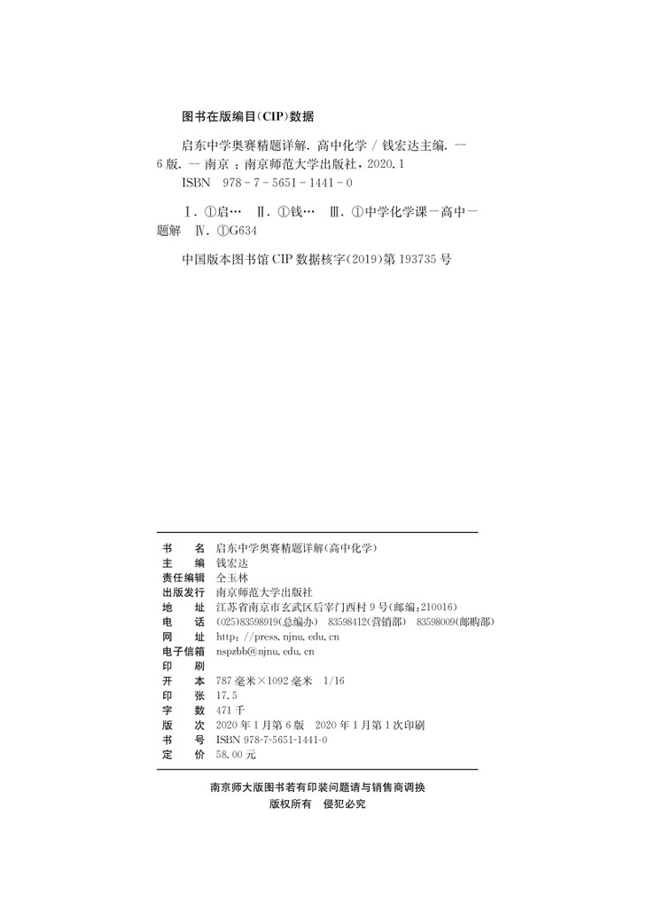 启东中学奥赛系列丛书:高中化学(训练教程+精题详解)钱宏达主编