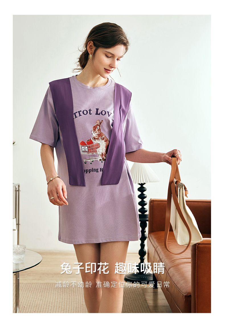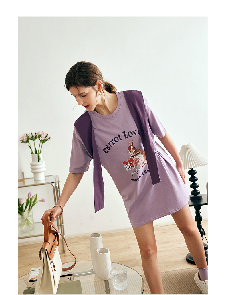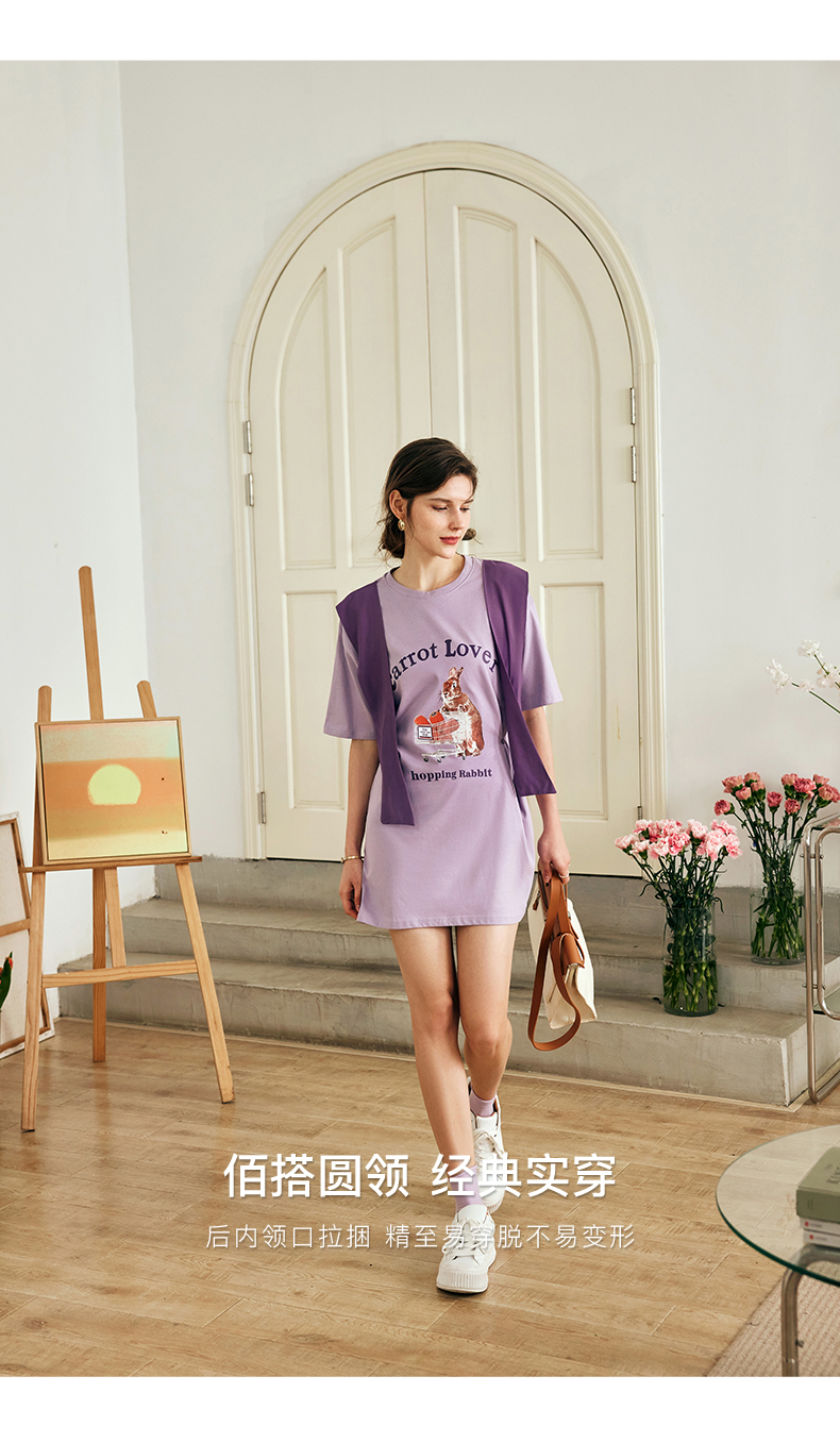 OLrain欧芮儿法式紫色短袖T恤女夏季2023新款披肩印花中长款上衣