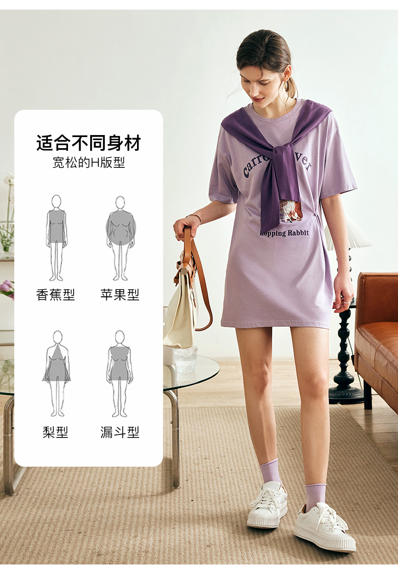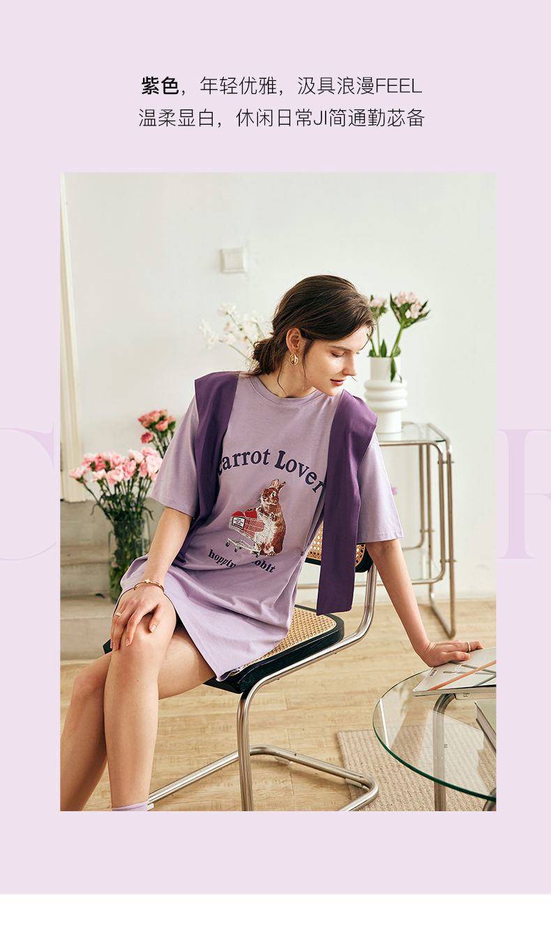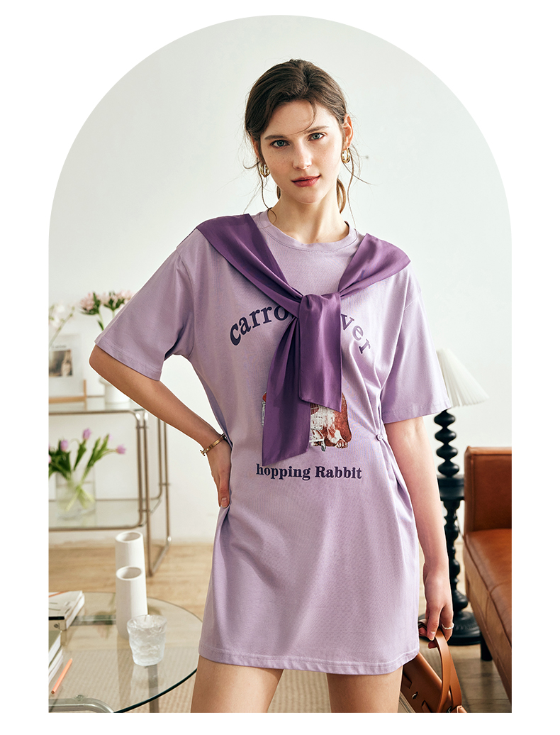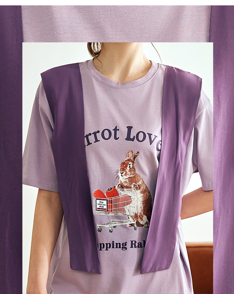OLrain欧芮儿法式紫色短袖T恤女夏季2023新款披肩印花中长款上衣
