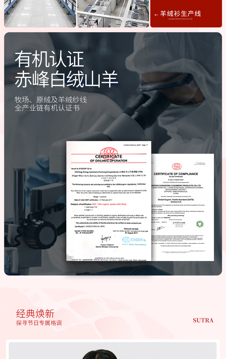 东黎羊绒是赤峰东荣集团自主品牌,自有牧场/羊绒制品全产业链优势,实现了羊绒从“牧场”到“商场”的华丽转变。