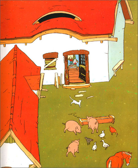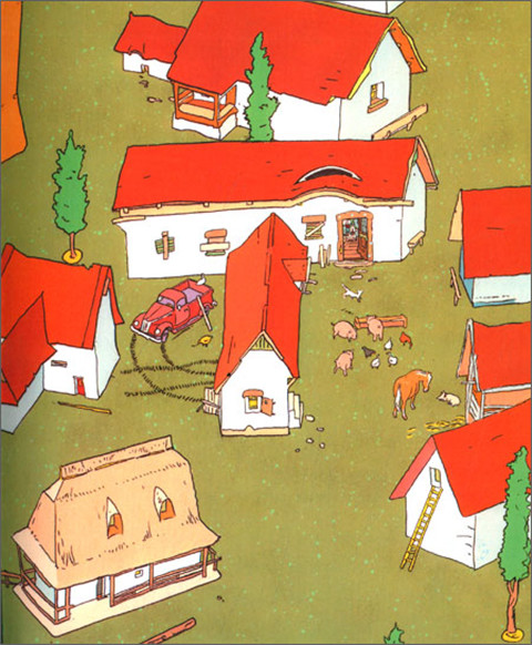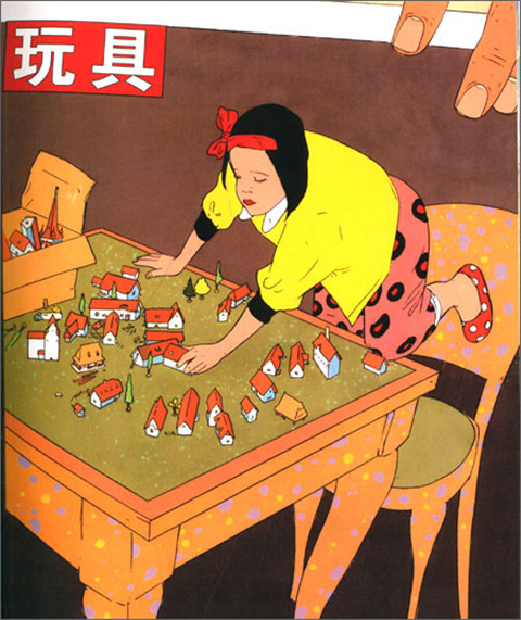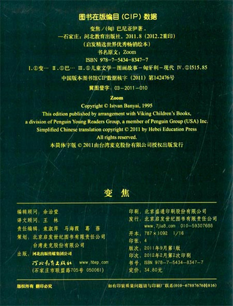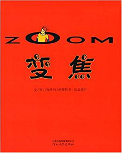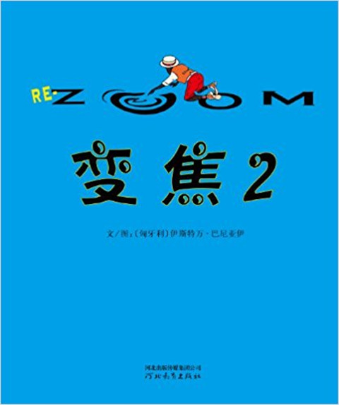 把镜头向前推,看到一只鸡,把镜头向后拉,原来是一个孩子在玩模型玩具。镜头再向前推近,你越来越不相信自己看到的,这个视觉游戏也越来越有趣呢。伊斯特万的《变焦》运用摄影镜头的特点,不用一个文字,设计每一页的图画,和读者玩猜谜语游戏。在翻页之间,他想告诉你的是,事情不一定是你看到的样子。就像这个不停旋转的世界,不停地变换焦点一样,我们只能抓稳镜头,跟着世界移转。