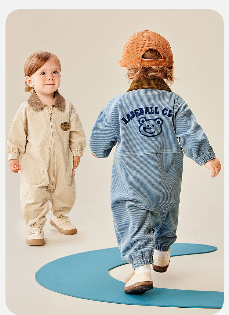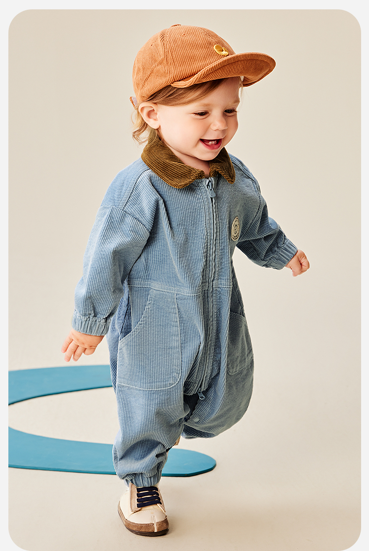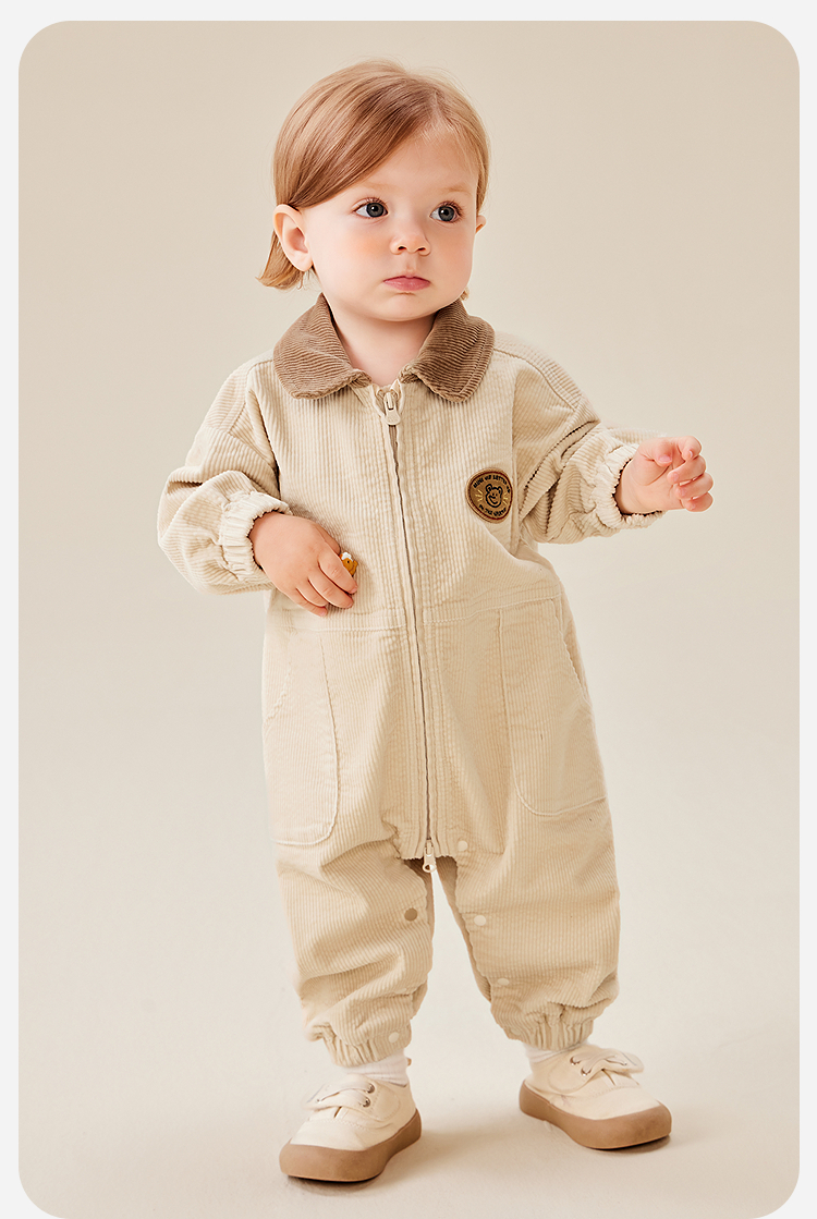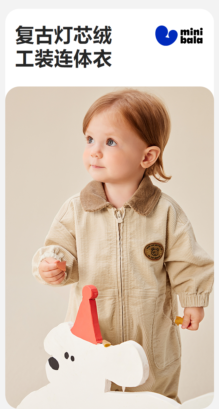 迷你巴拉婴童外出连体衣男女宝宝复古工装灯芯绒爬服2025年秋季