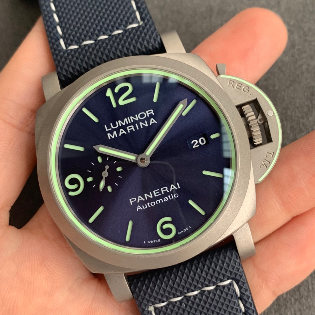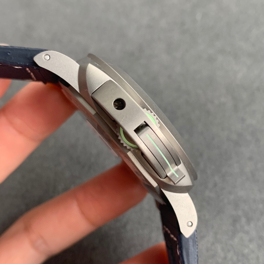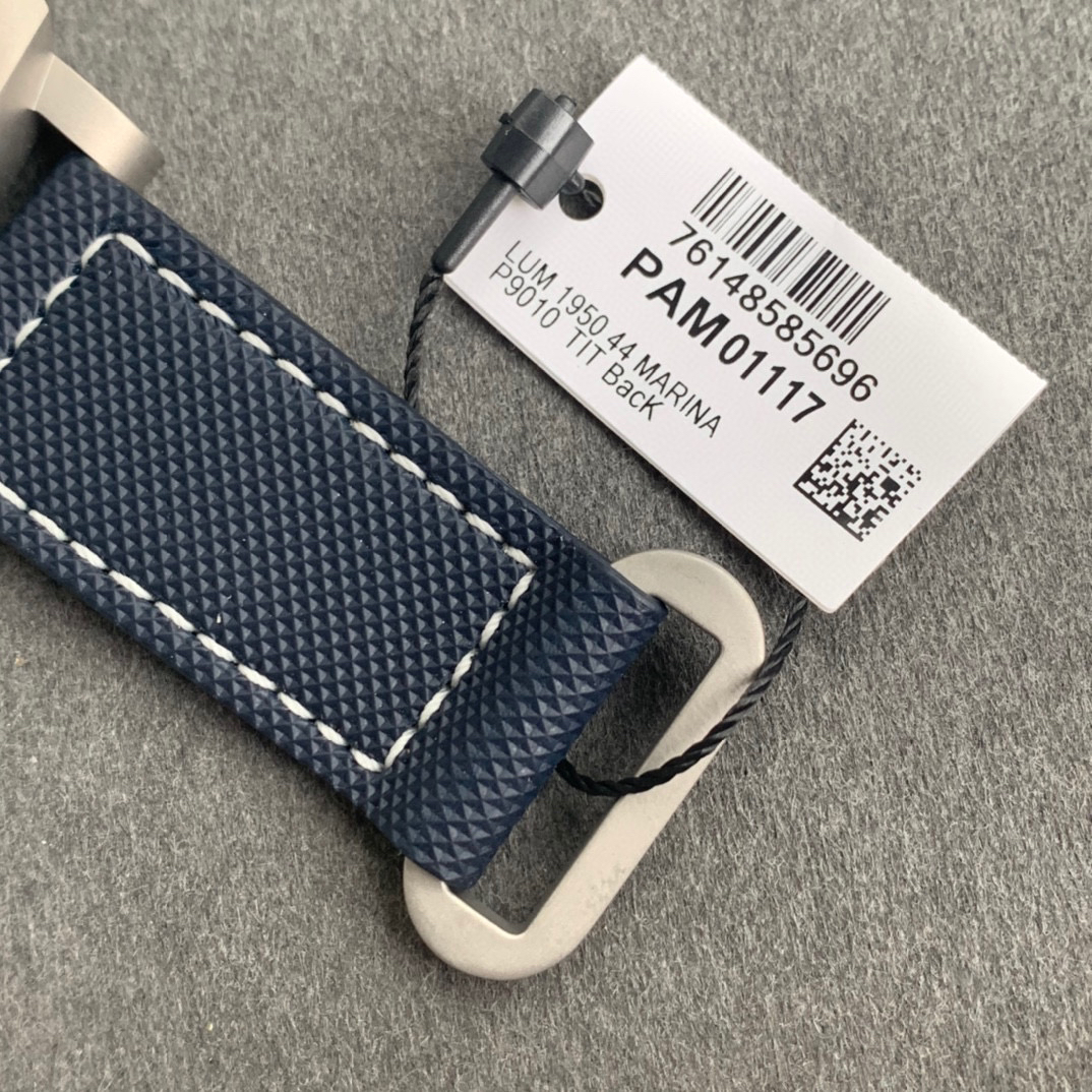 VS沛纳海44MM 男士腕表 PAM1117 镂空三文治超级夜光表盘,金属镭射钛金属表壳,蓝色夜光缝线表带,恐怕去看电影也得穿长袖遮住它的“万丈光芒”现购买赠送官网同款表层防水带一副!送完即止[耶]“超级夜光”